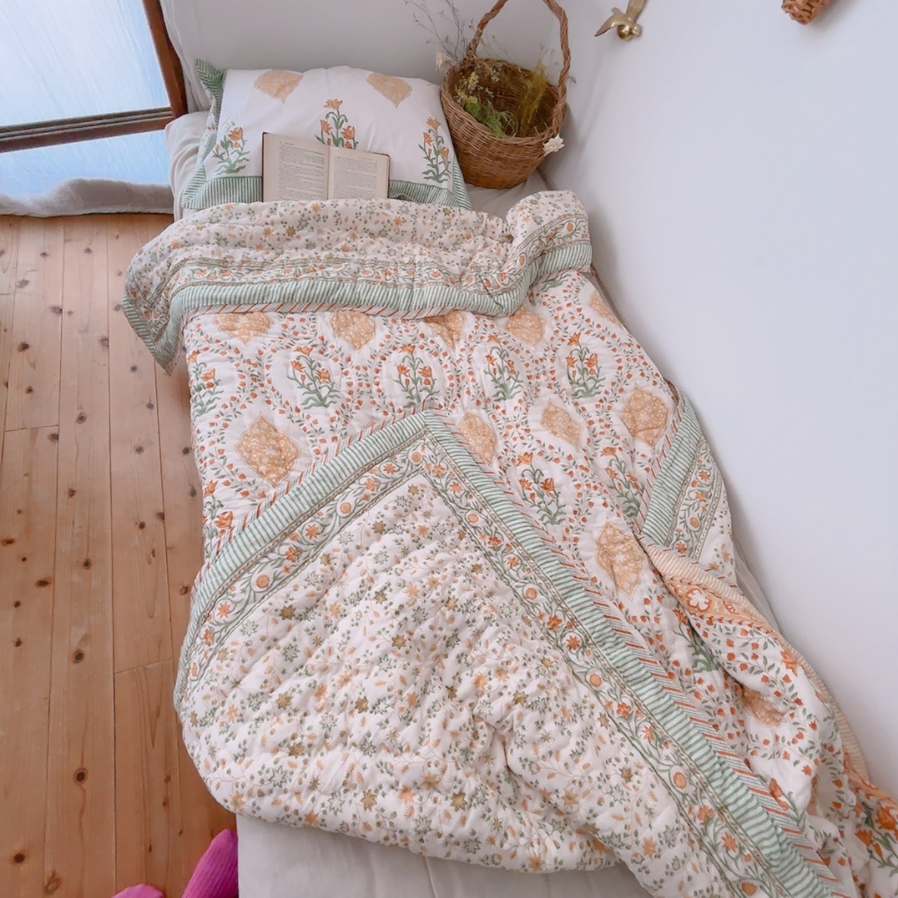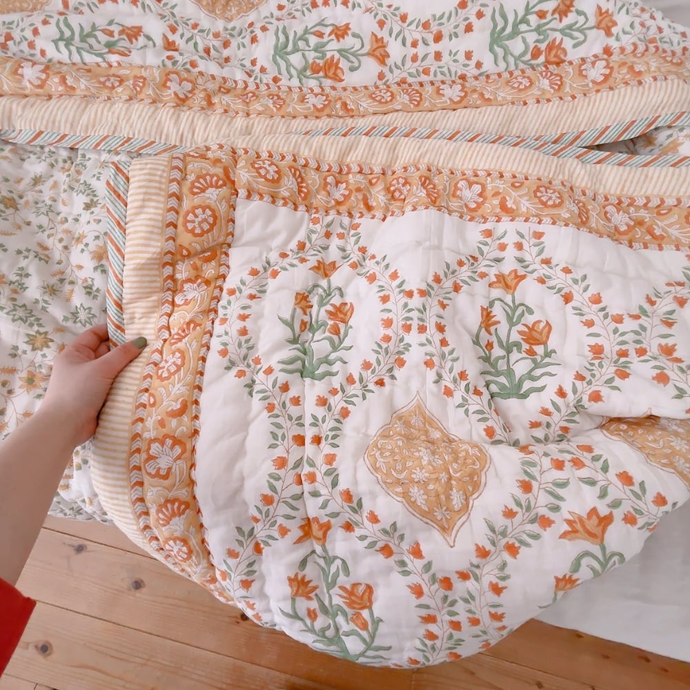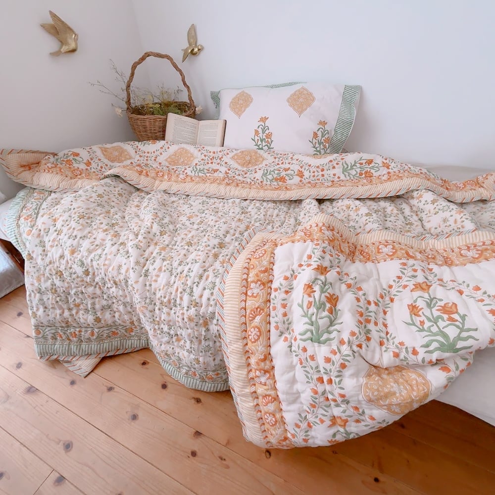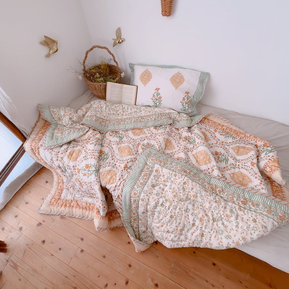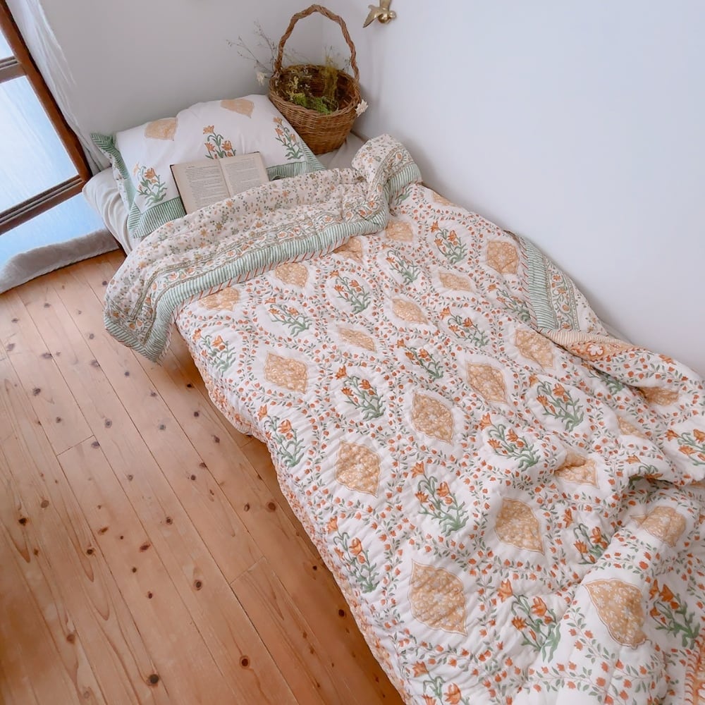 とても可愛らしいお花柄のブロックプリントの綿入りキルトです。