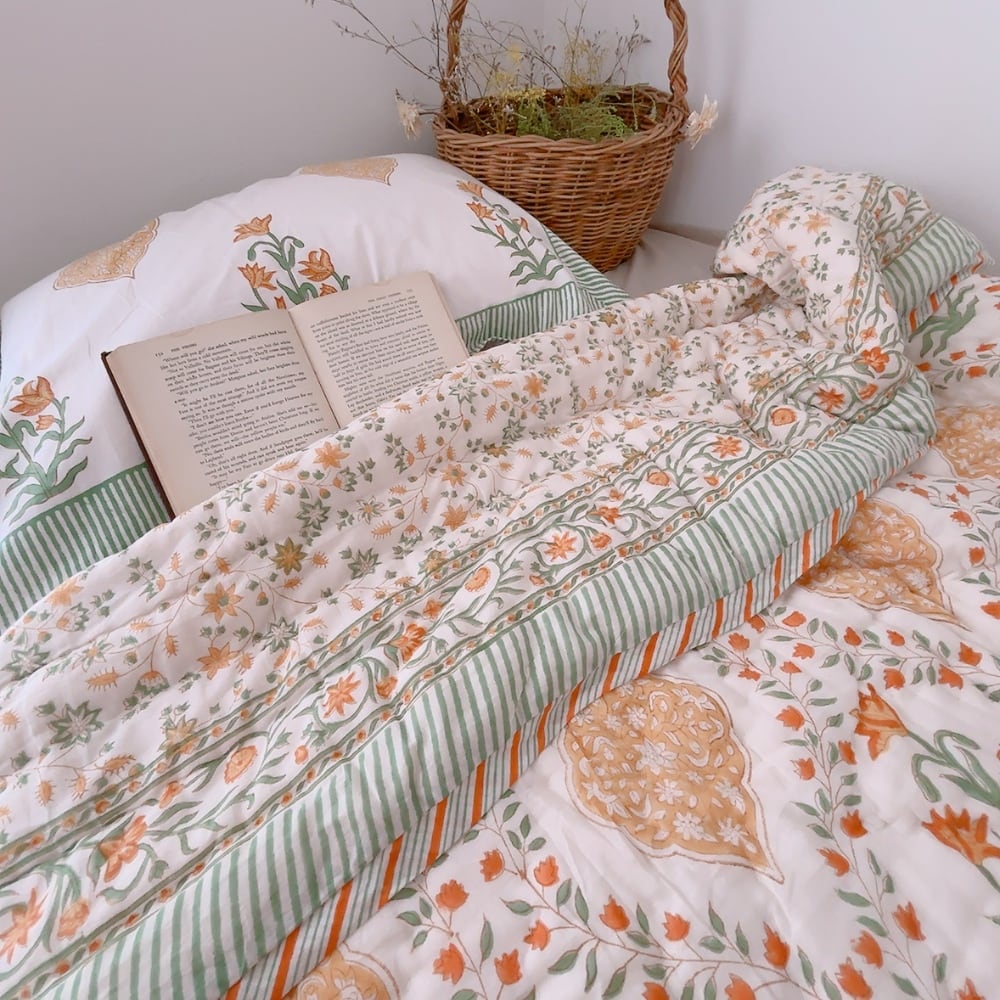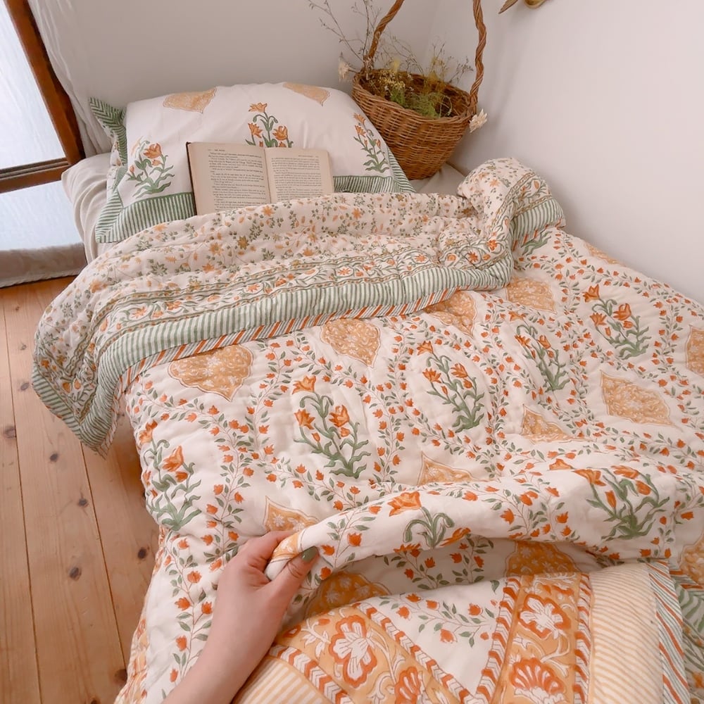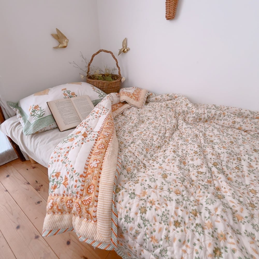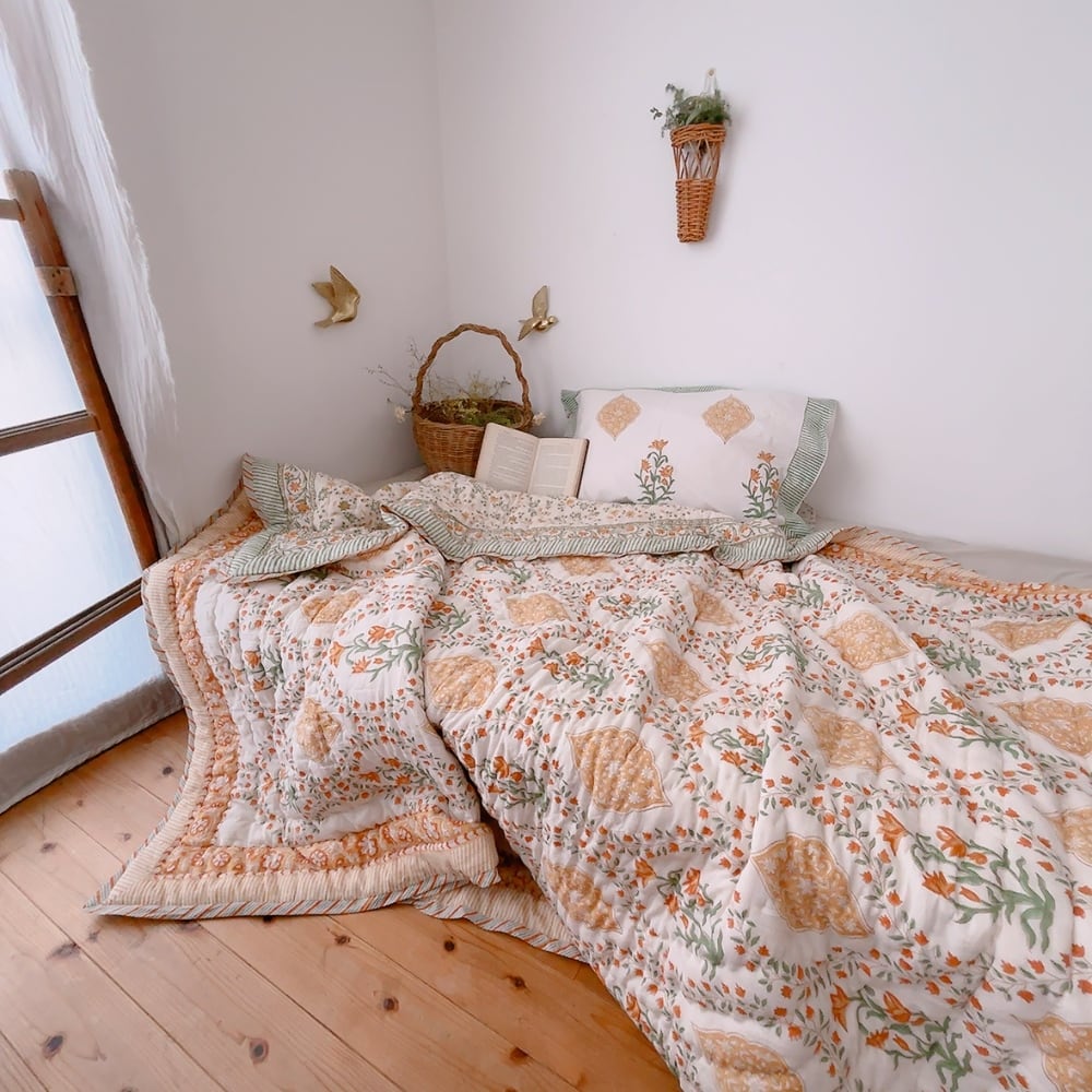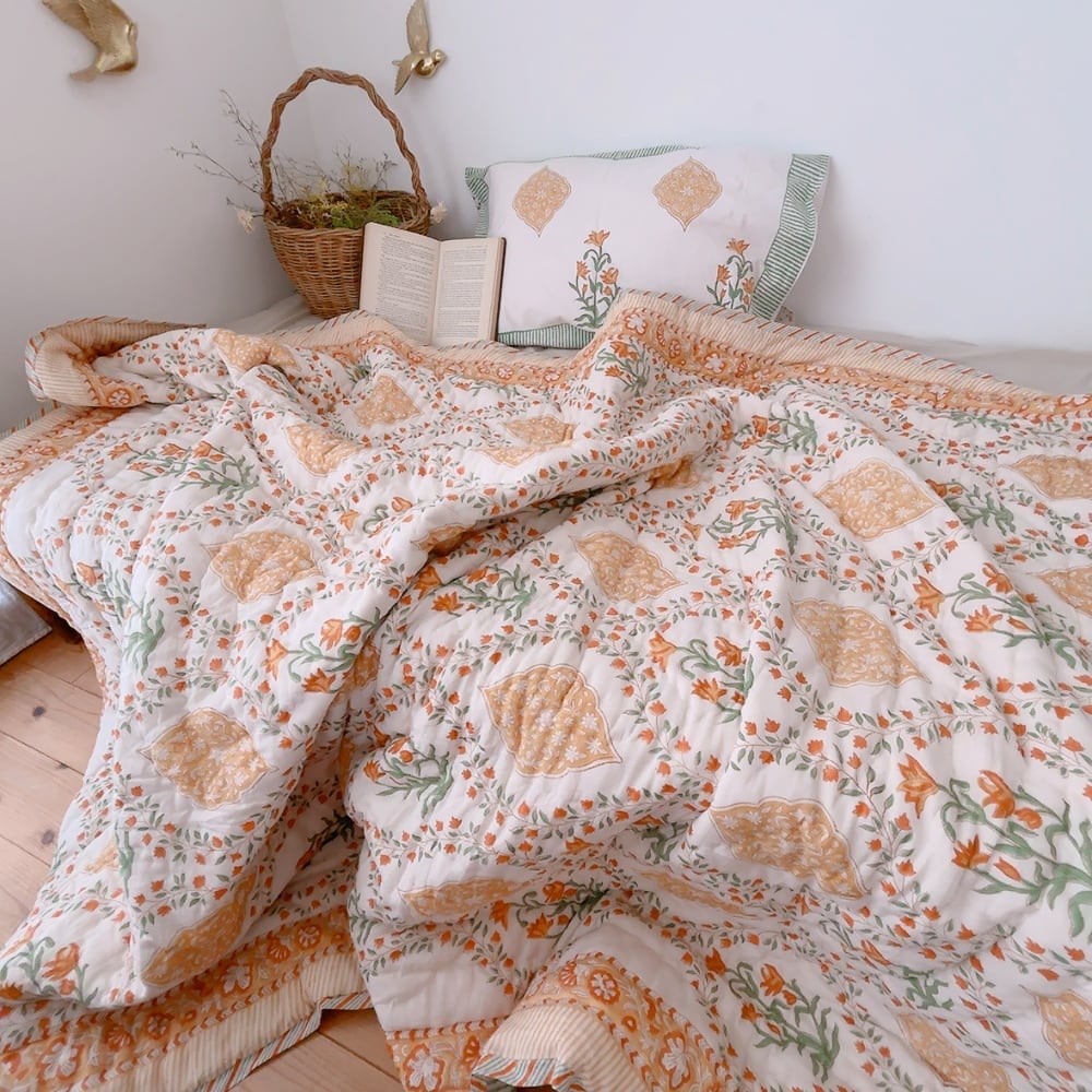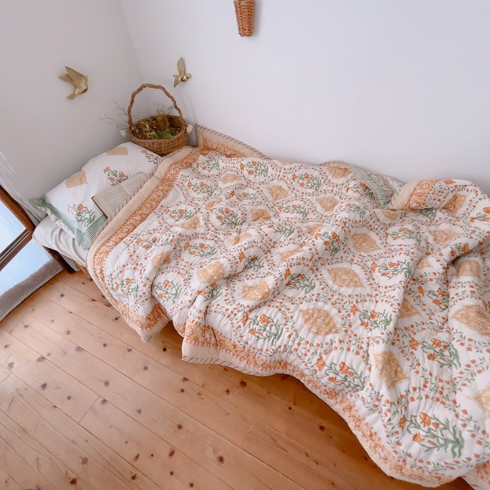 綿入り【M】ミモザの朝 ブロックプリントキルト