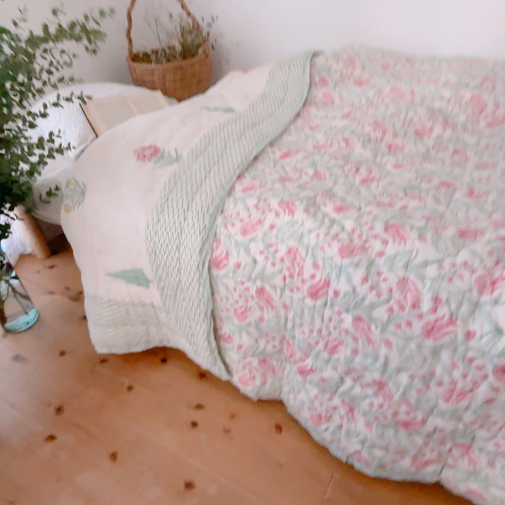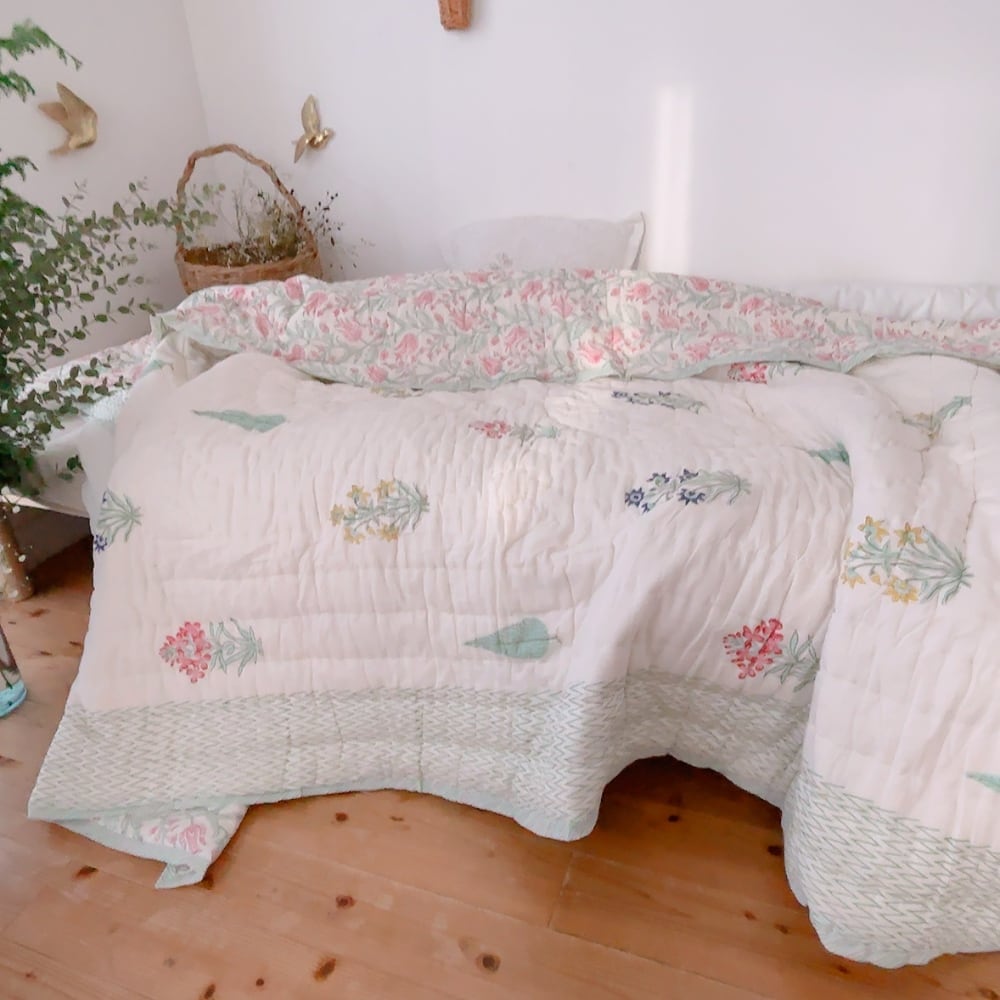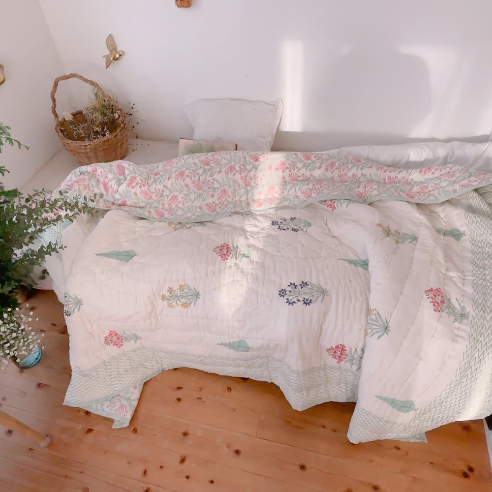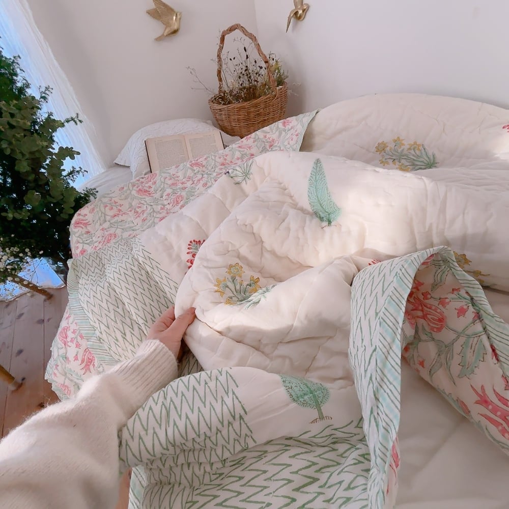 綿入りのブロックプリントキルトです。