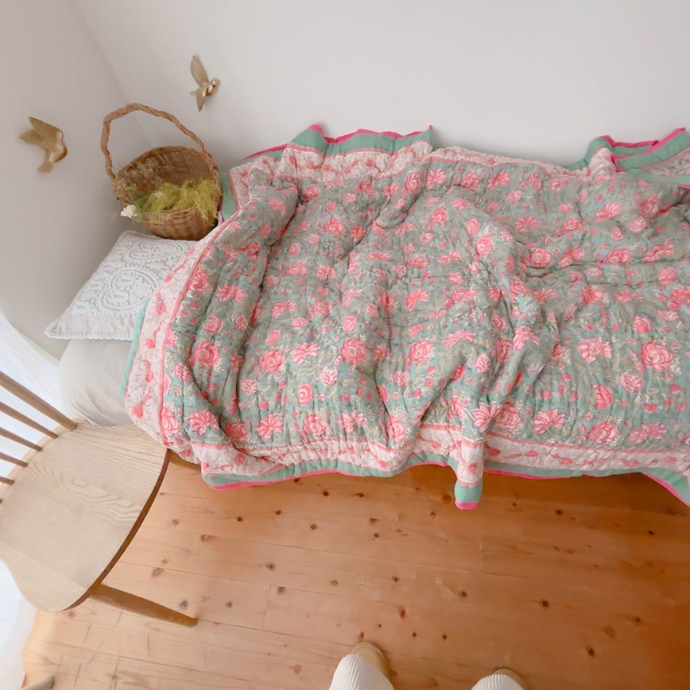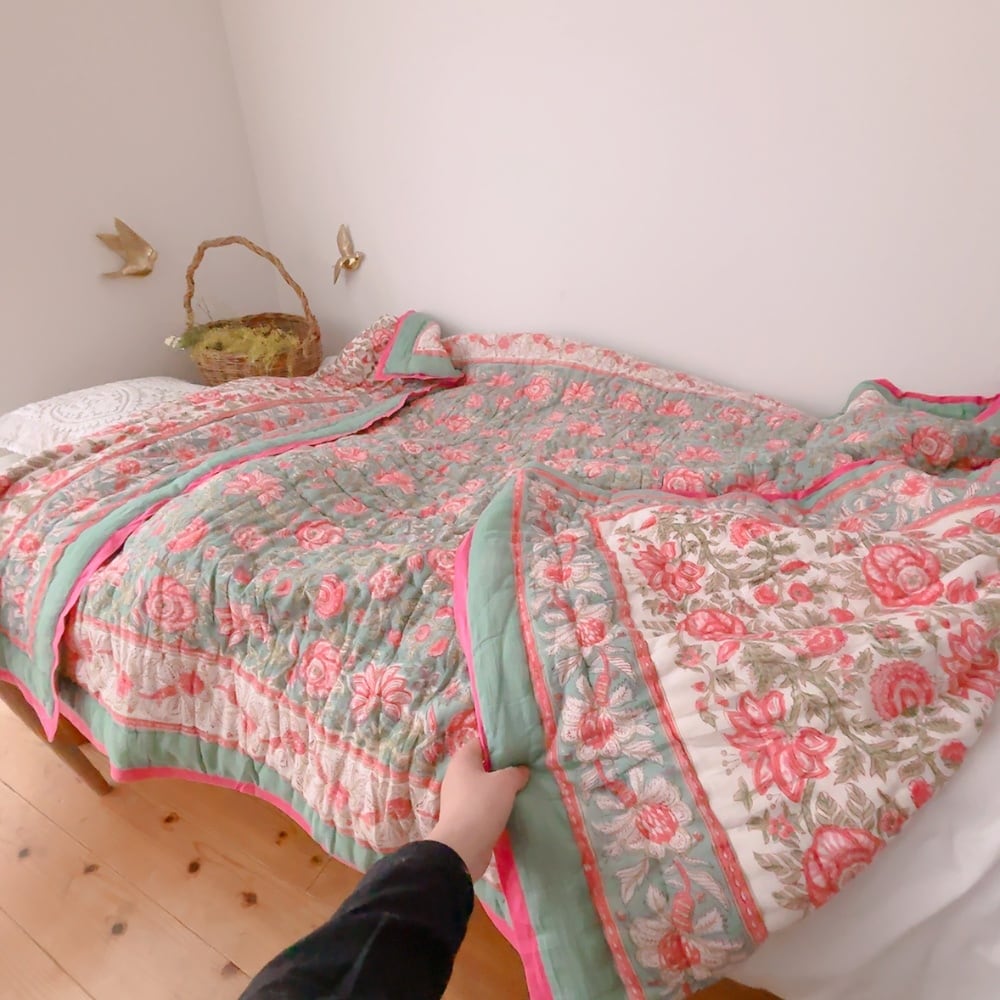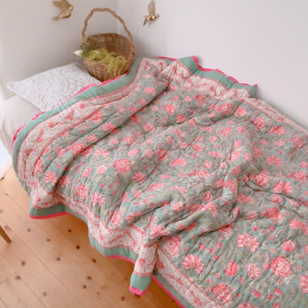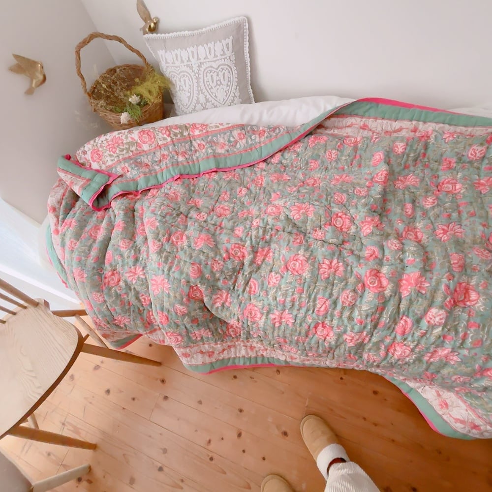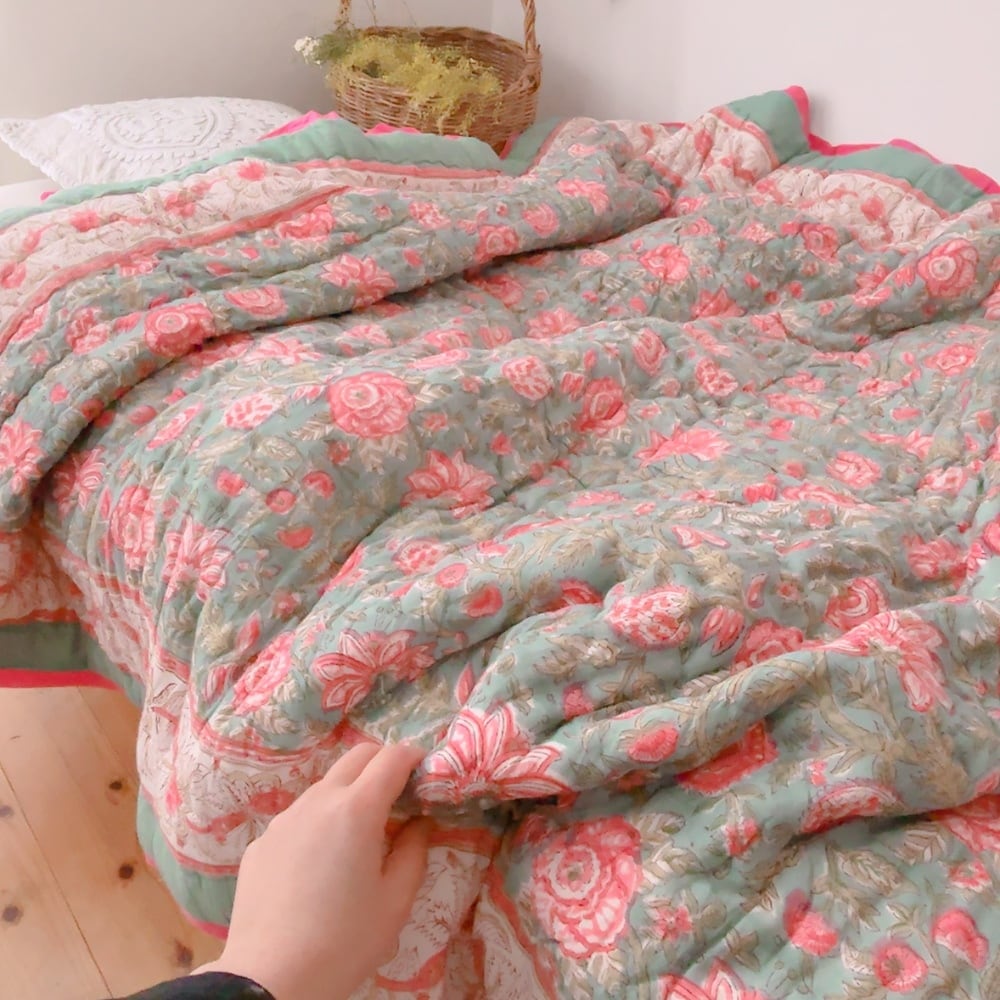 omさま 6月末発送予定【受注】M・天使なピンクフローラル ブロックプリントキルト