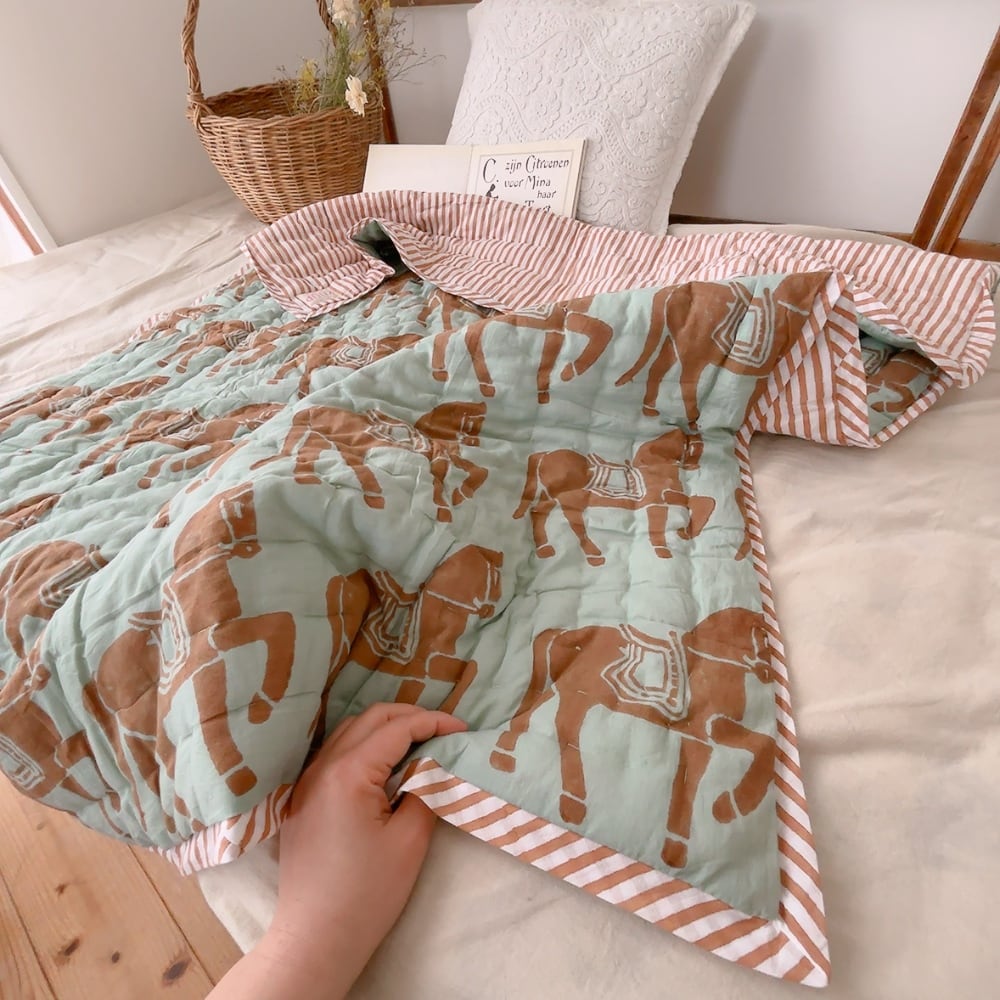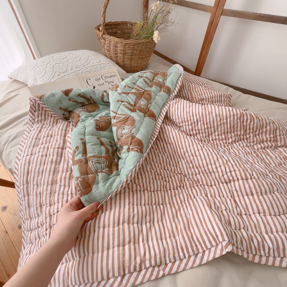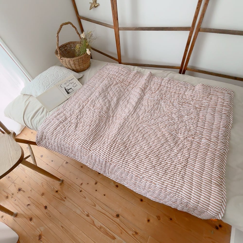 綿入りのブロックプリントキルトです。