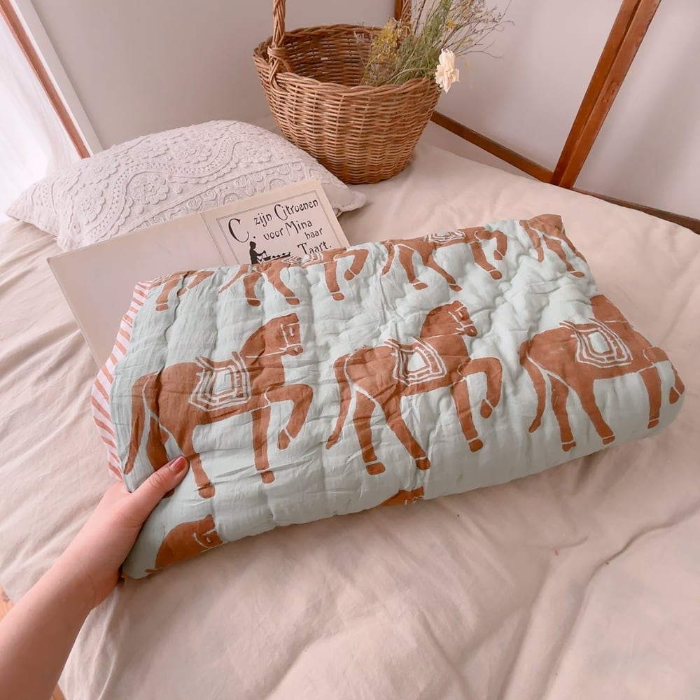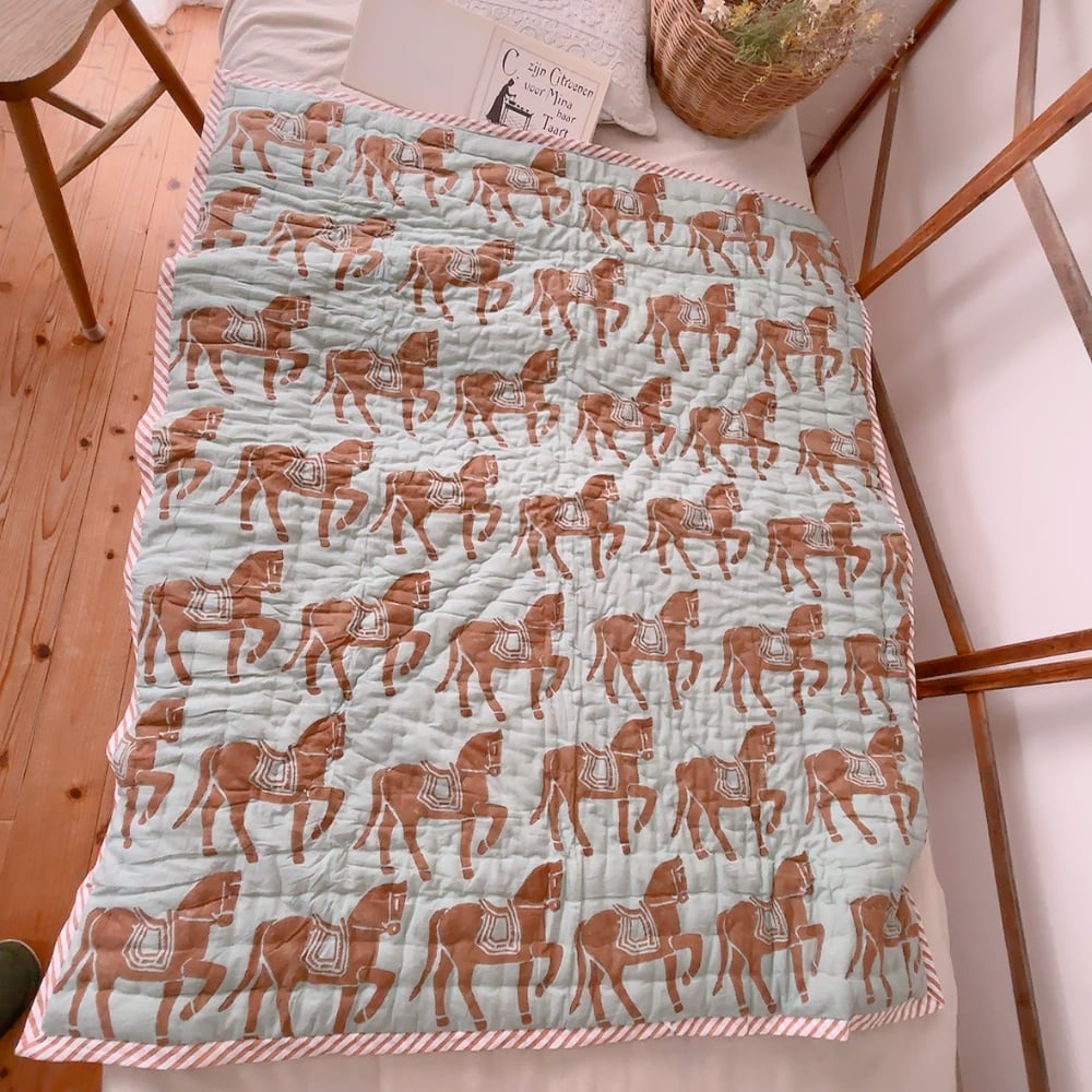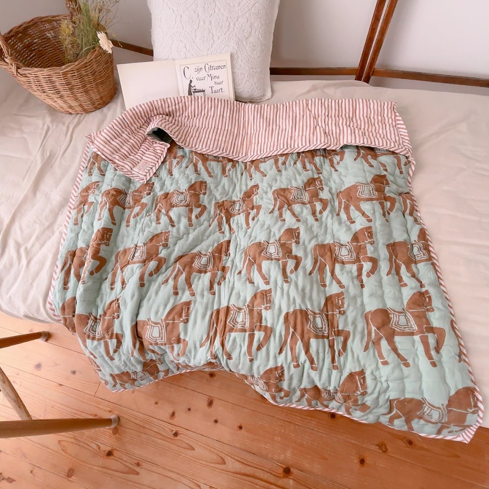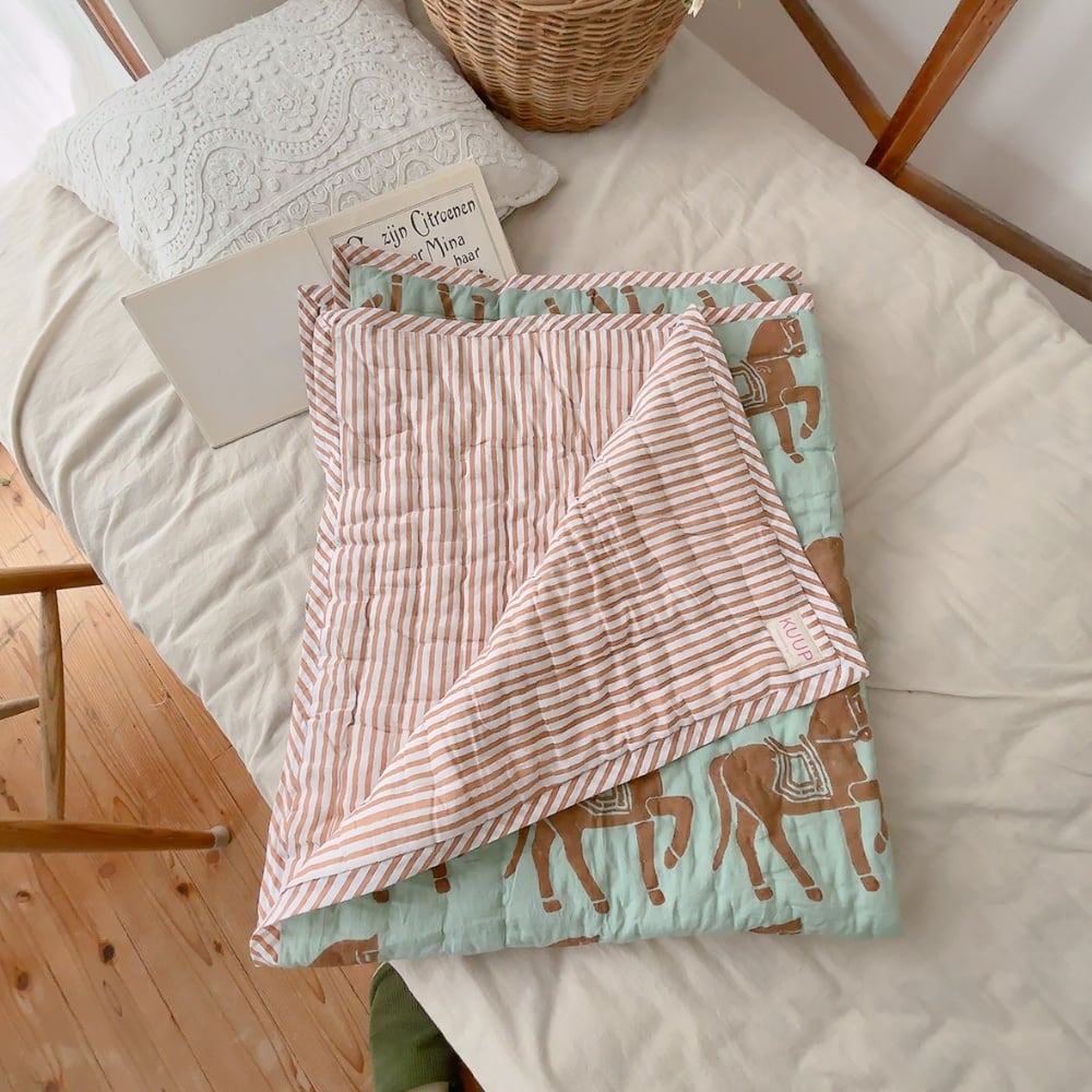 綿入りのブロックプリントキルトです。