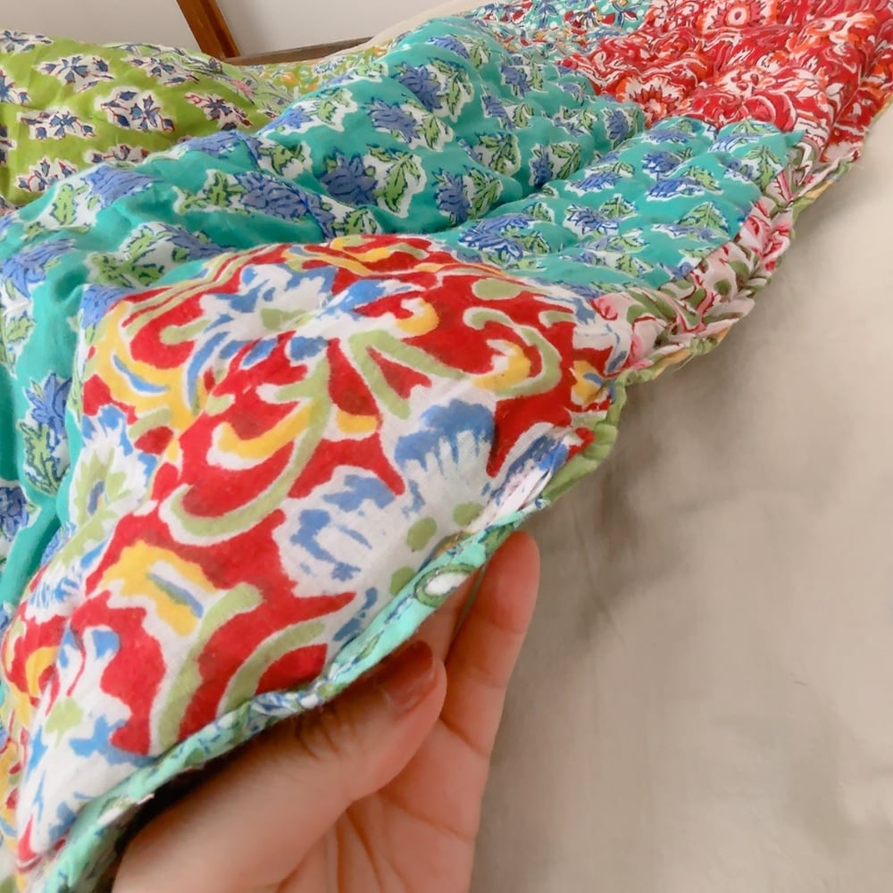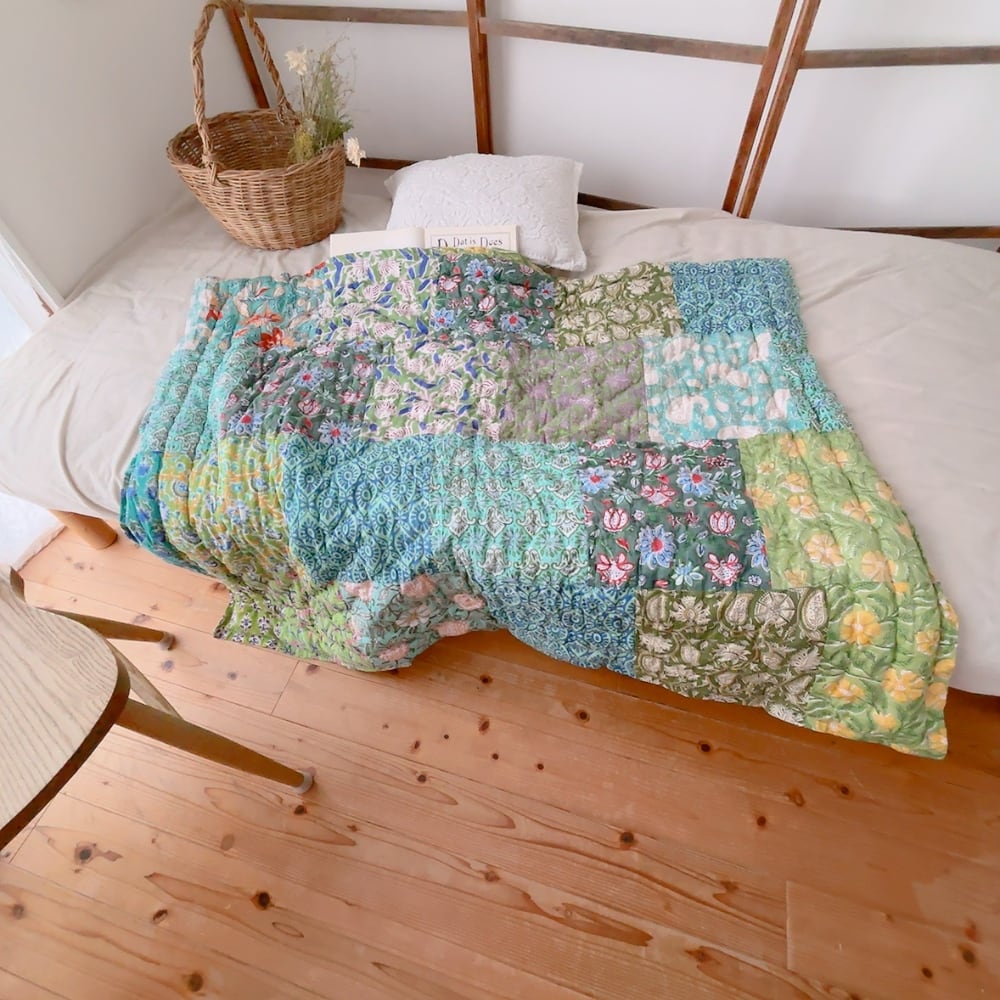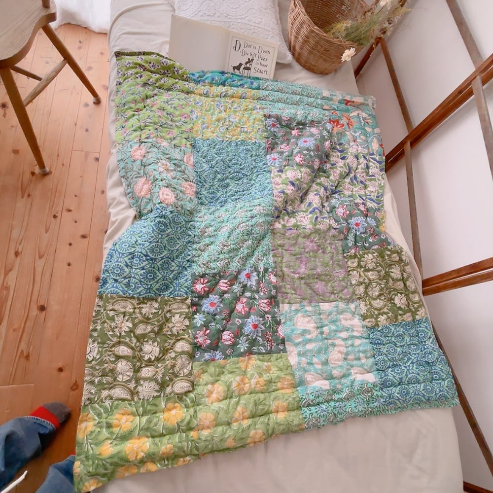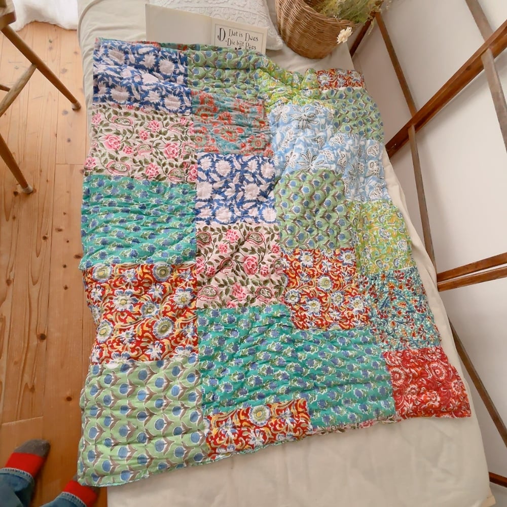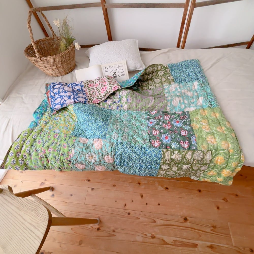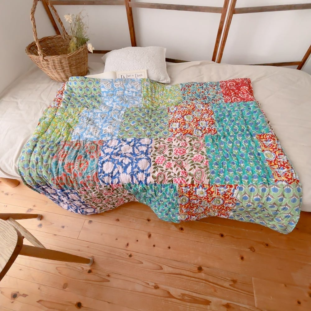綿入りのブロックプリントキルトです。