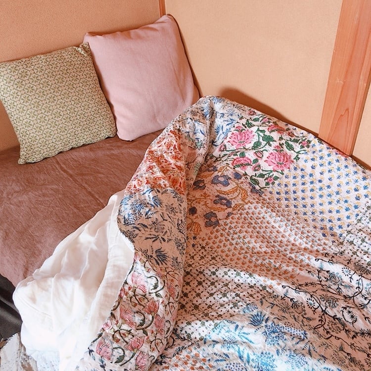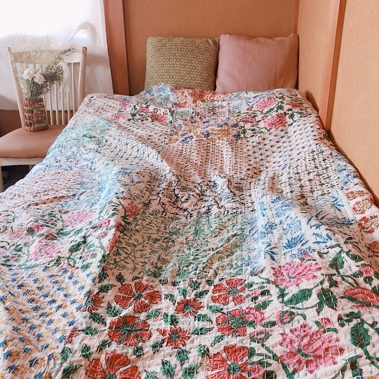 (L)パッチワークキルト ブロックプリントキルト ベッドカバー ソファーカバー
