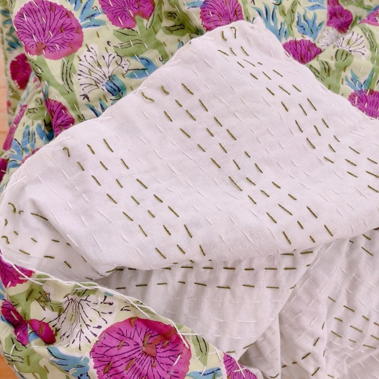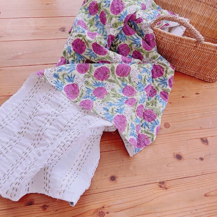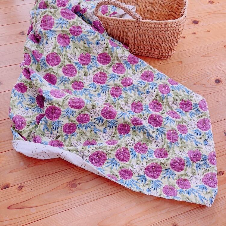 (S)パープルフラワーキルトさん ベビーキルト ひざかけ ブッロクプリントキルト