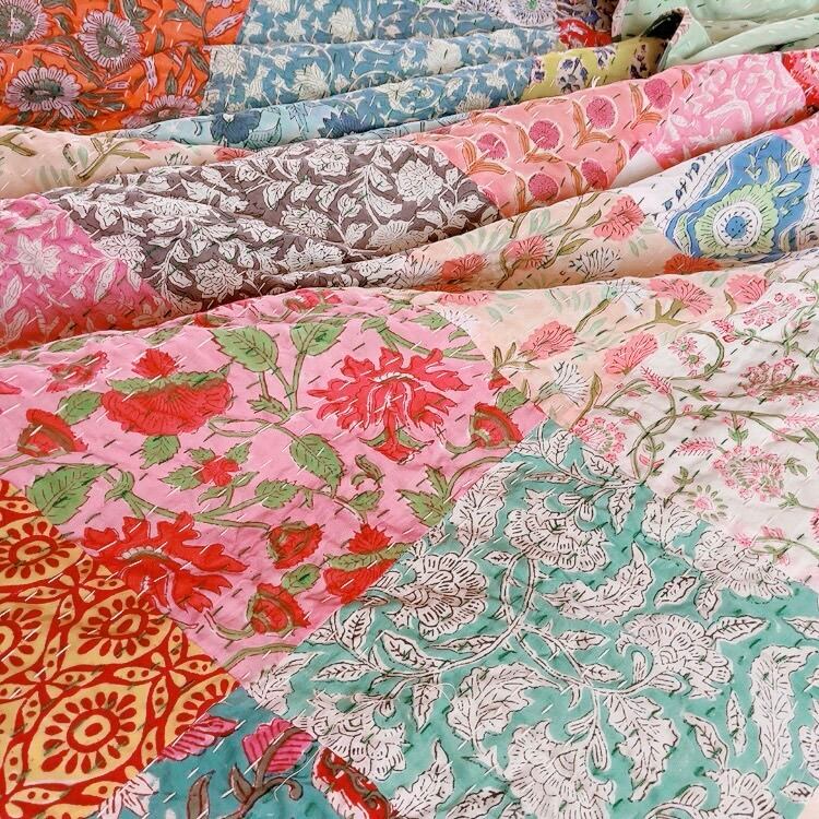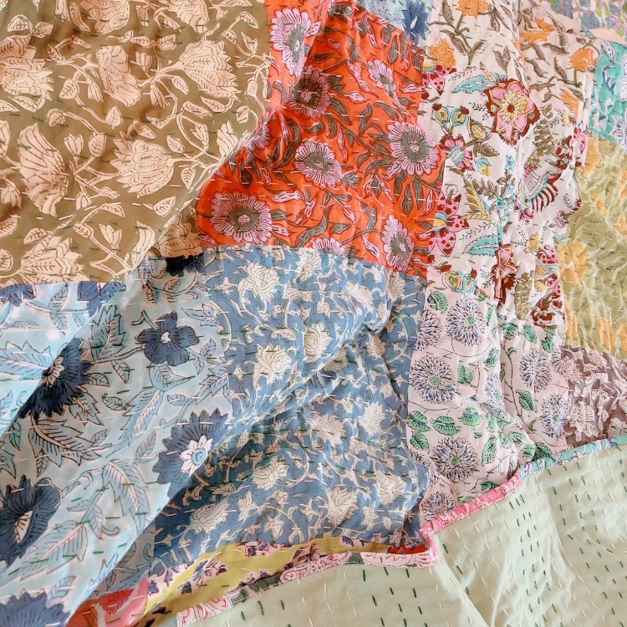 (M)グリーンパッチワークキルト ベッドカバー ソファーカバー カンタキルト