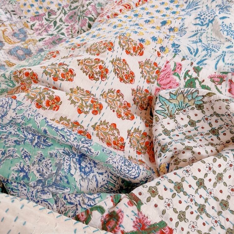 ホワイト系の可愛らしいパッチワークのキルトです。