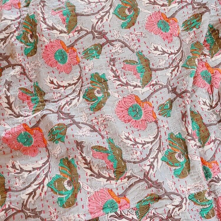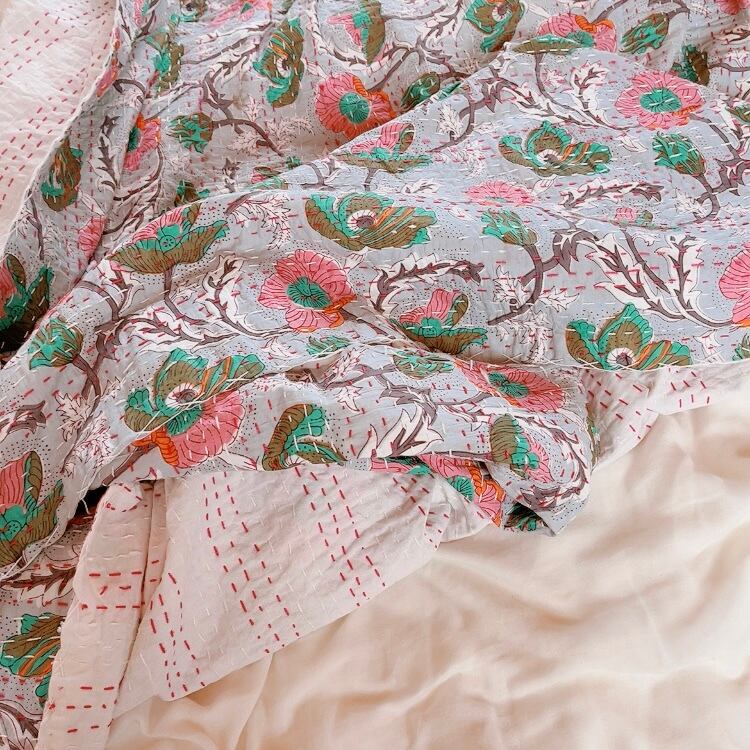 (M)フラワー ブロックプリントキルト カンタキルト ベッドカバー ソファーカバー