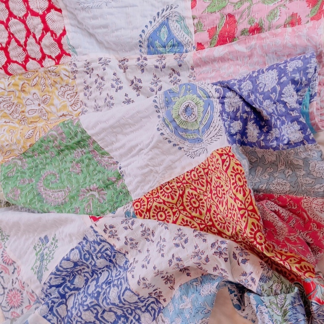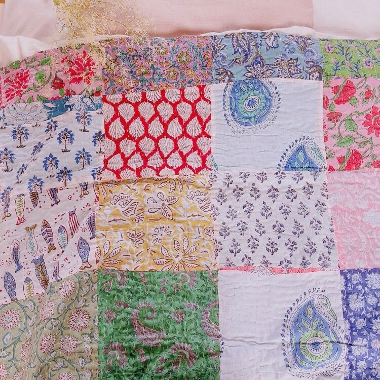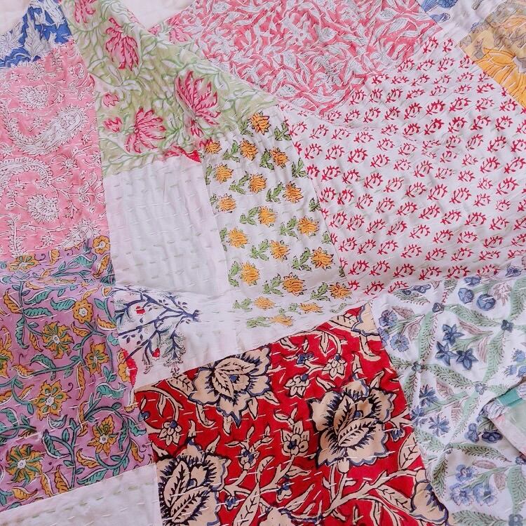 (S)ターコイズブルー パッチワーク ベビーキルト ひざかけ ブッロクプリントキルト