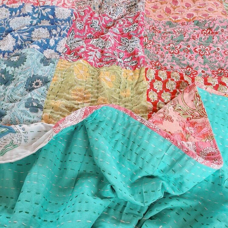 (M)ターコイズブルーパッチワークキルト ベッドカバー ソファーカバー カンタキルト