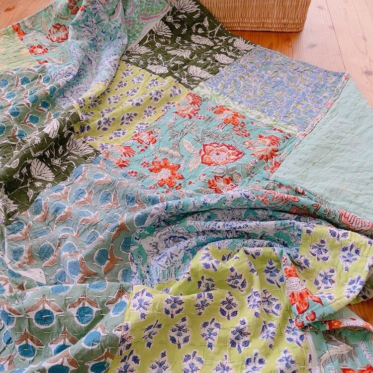 グリーン系の生地を集めたベビーサイズのキルトです。