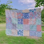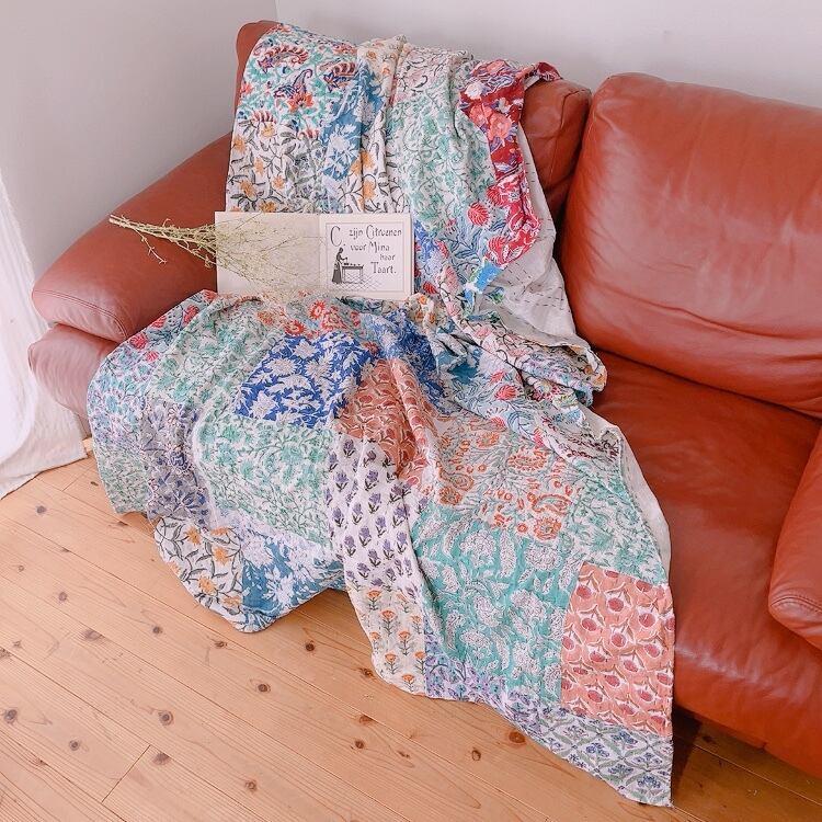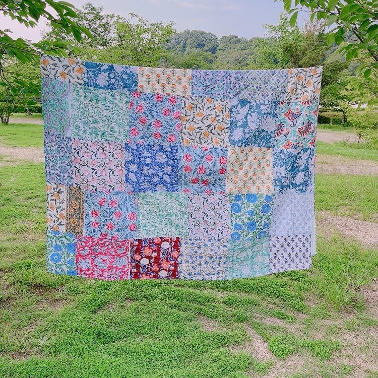 【M】Whiteカラフル(カーキステッチ) ブロックプリントキルト