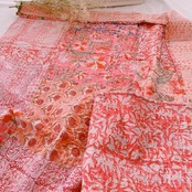 ピンク系のブロックプリント生地を集めたベビーサイズのキルトです。