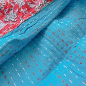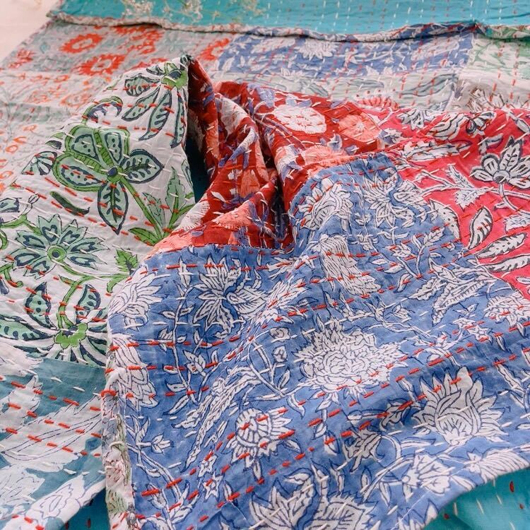 カラフルなブロックプリント生地を集めたビーサイズのキルトです。