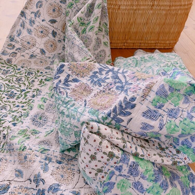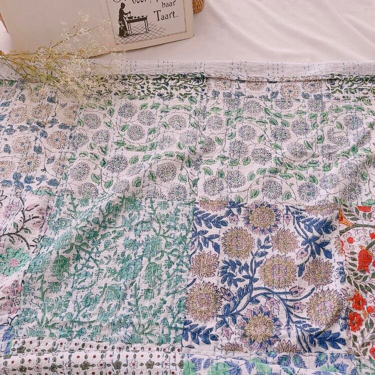 明るめのブロックプリント生地を集めたビーサイズのキルトです。