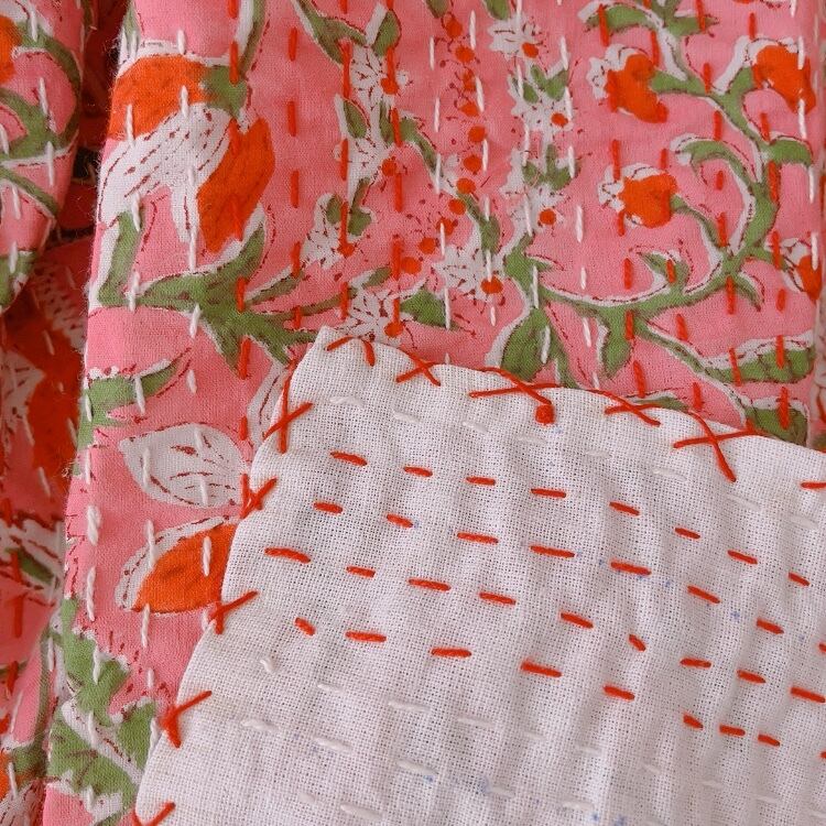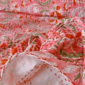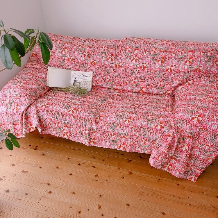 ピンク系のお花柄の可愛らしいデザインのブロックプリントキルトです。