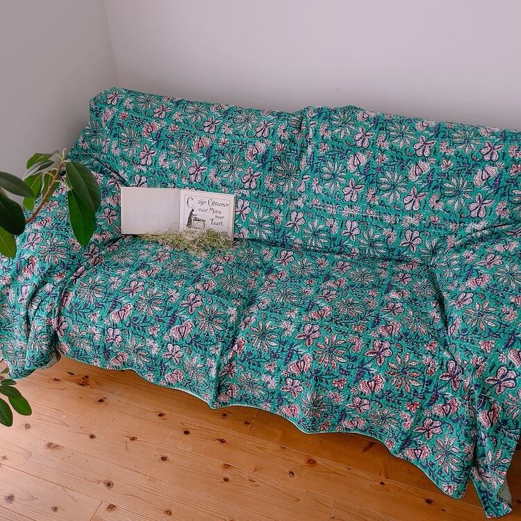 グリーン地お花柄の可愛らしいデザインのブロックプリントキルトです。