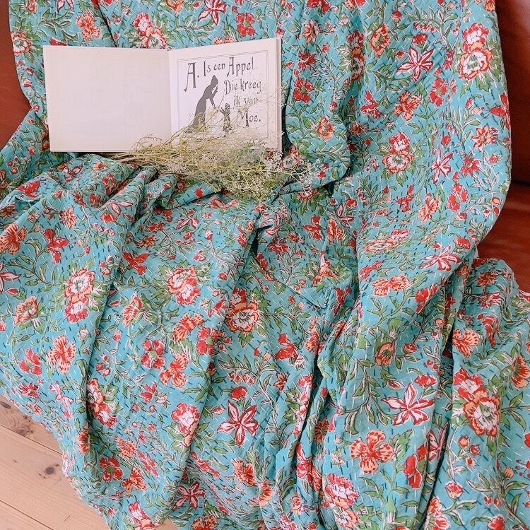 グリーン地(青緑)にお花柄の可愛らしいデザインのブロックプリントキルトです。