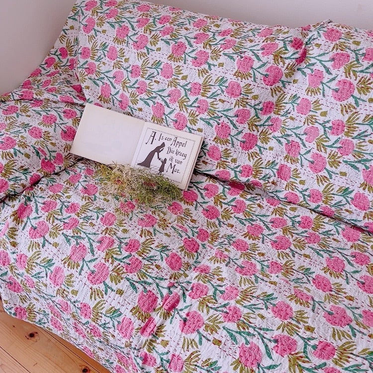 白地にピンクのお花柄の可愛らしいデザインのブロックプリントキルトです。