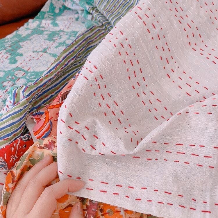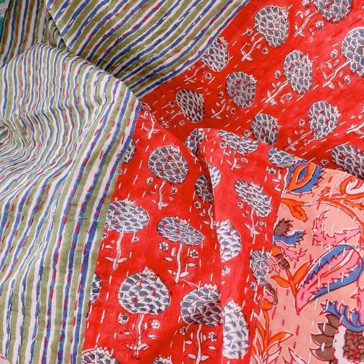 ブロックプリントの生地を、ユニークな組合せでしましまにパッチワークした