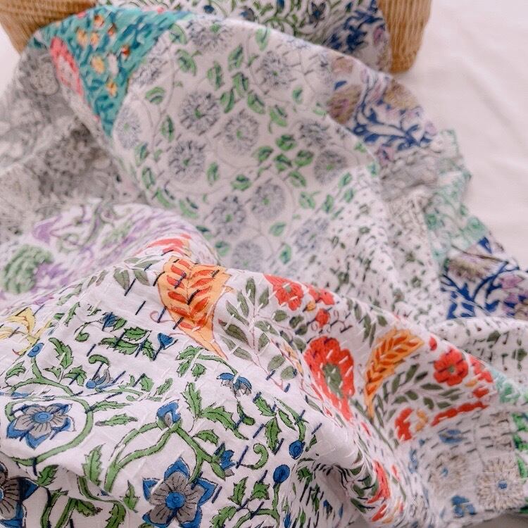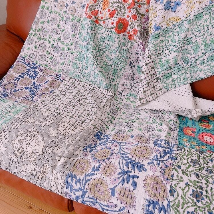明るめのブロックプリント生地を集めたビーサイズのキルトです。