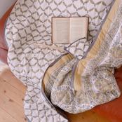 シックなナチュラルイエローのブロックプリントの綿入りキルトです。
