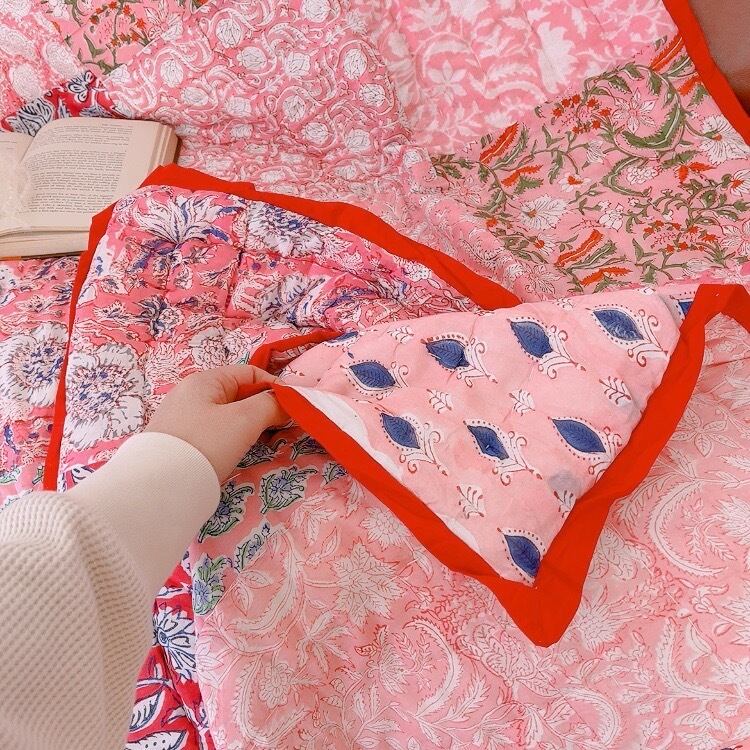 ピンク系のブロックプリント生地を集めたパッチワークの