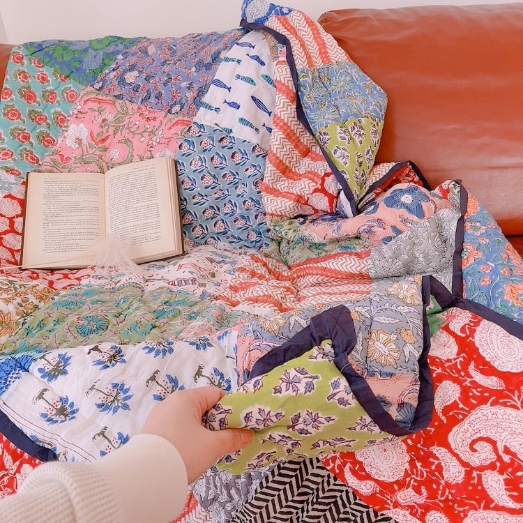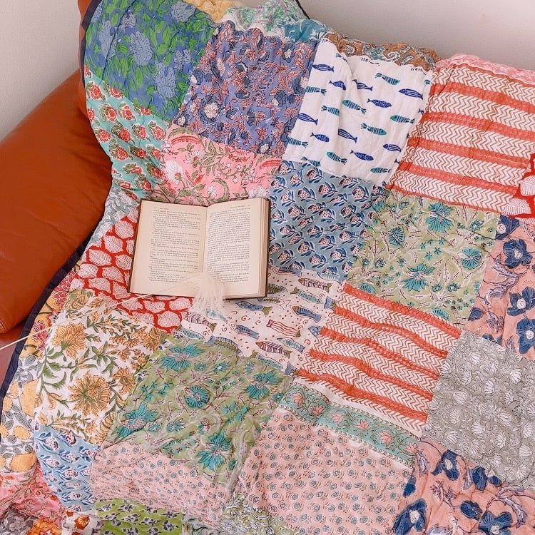 ピンク系のブロックプリント生地を集めたパッチワークの