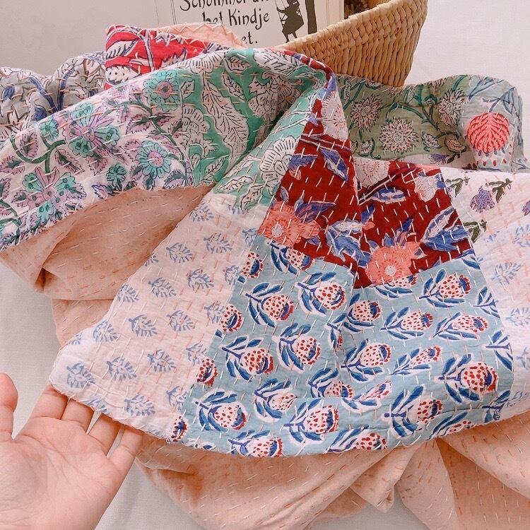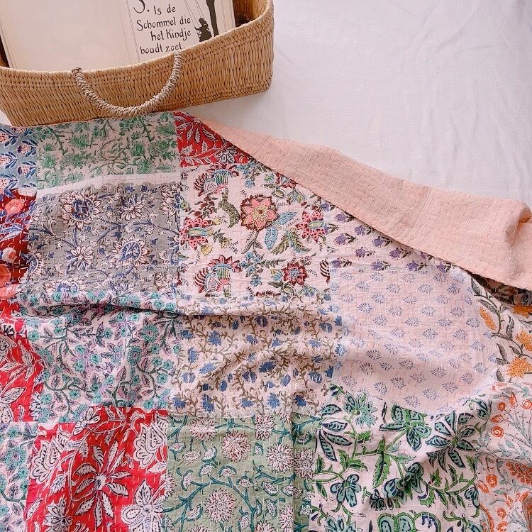 【S】Pinkカラフル ベビーキルト・ブロックプリントキルト