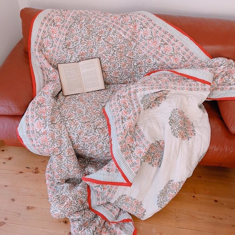 とても可愛らしいお花柄のブロックプリントの綿入りキルトです。