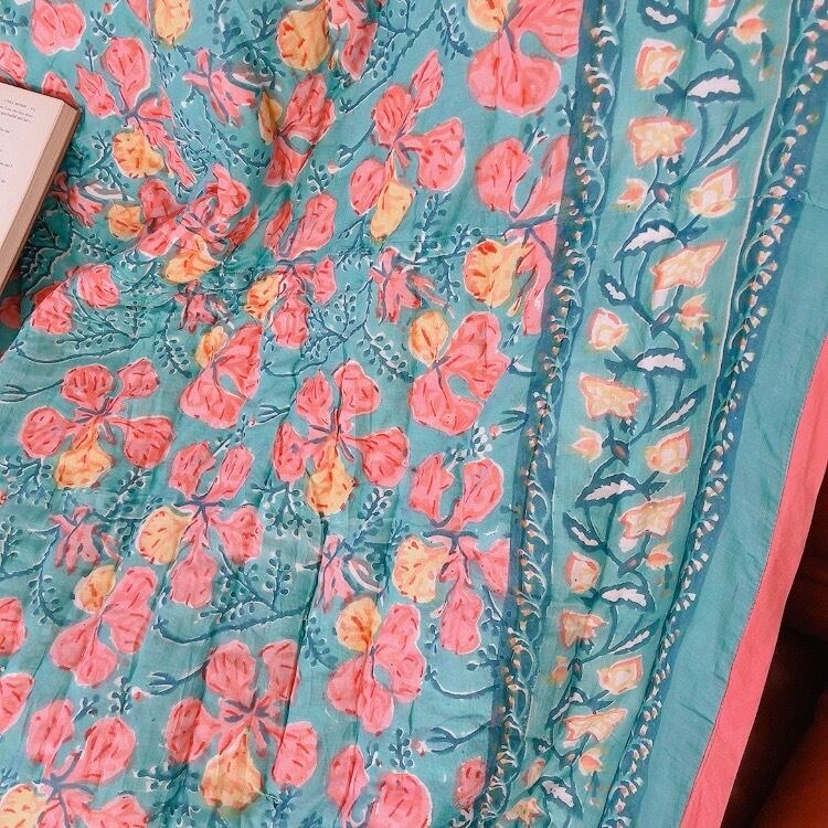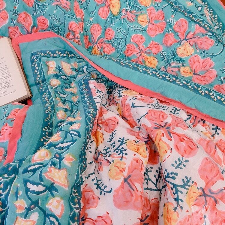 とても可愛らしいお花柄のブロックプリントの綿入りキルトです。