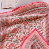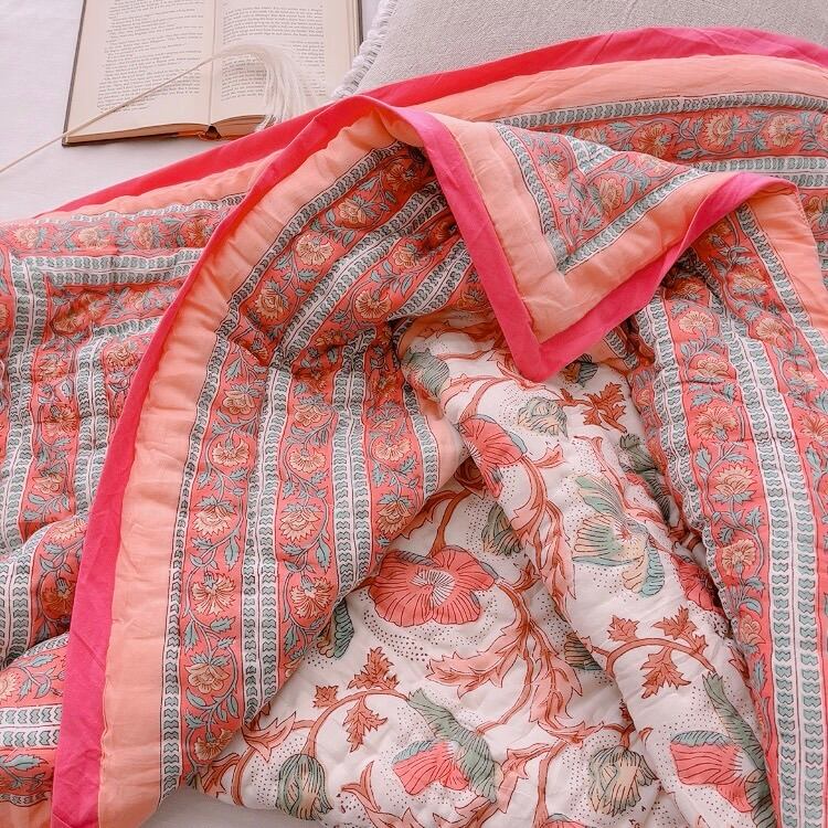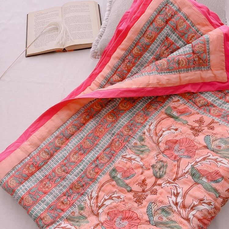 とても可愛らしいお花柄のブロックプリントの綿入りキルトです。