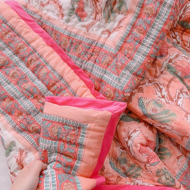 綿入り【big baby】ピンクフラワー ブロックプリントキルト