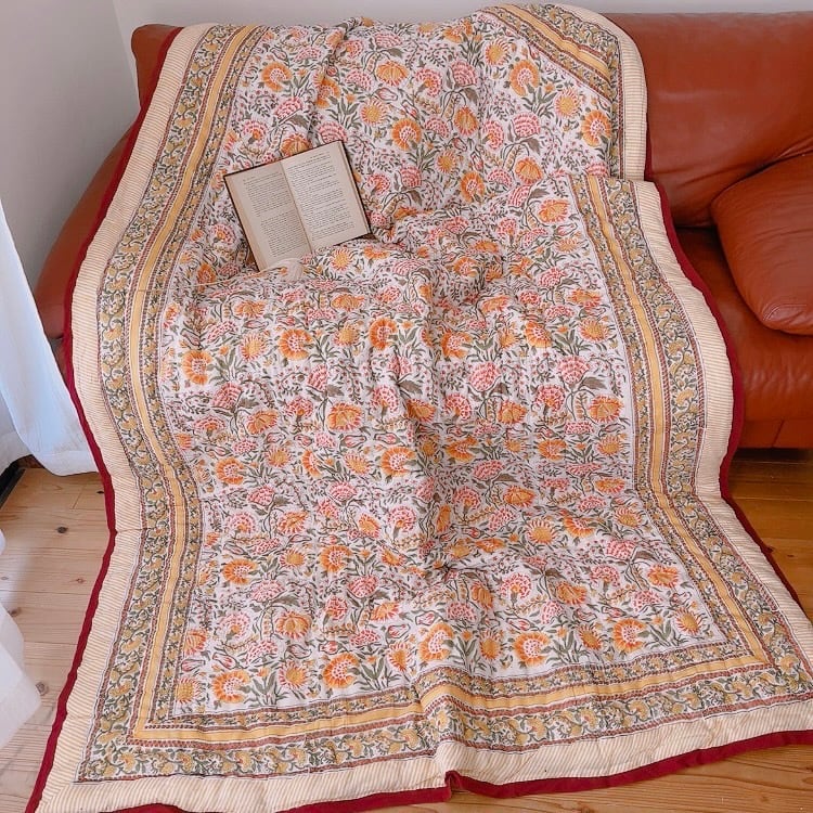 明るく可愛らしくエレガントなお花柄のブロックプリントの綿入りキルトです。