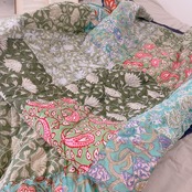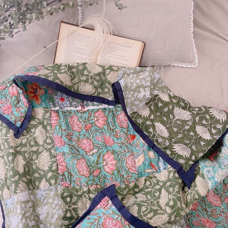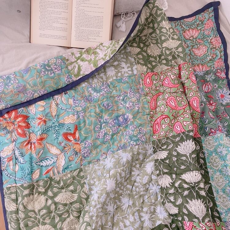 グリーン系のブロックプリント生地を集めたパッチワークの
