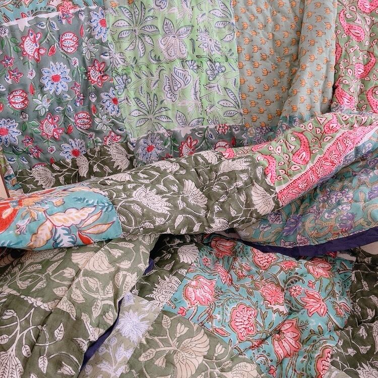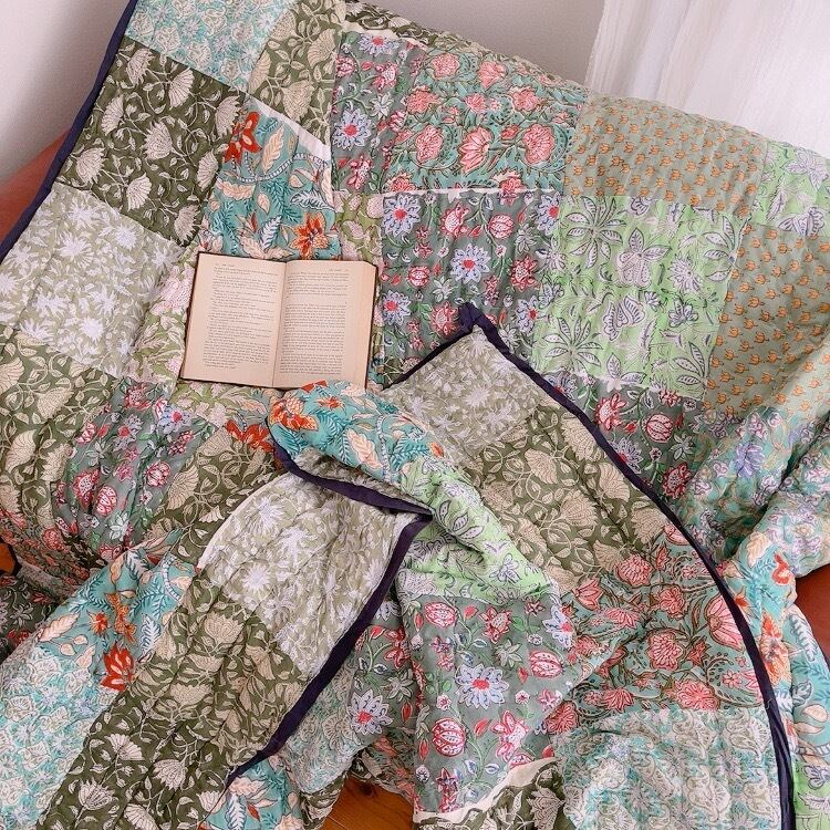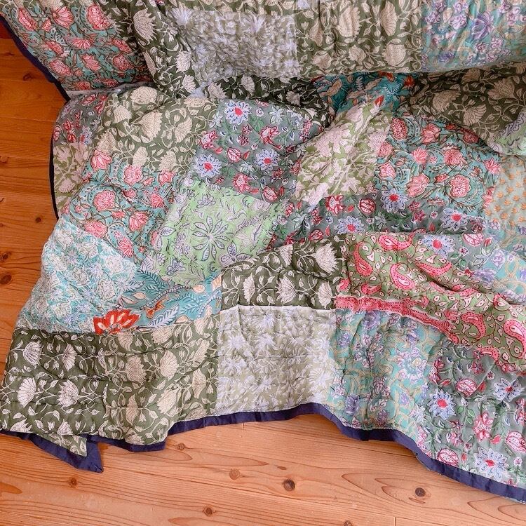 グリーン系のブロックプリント生地を集めたパッチワークの