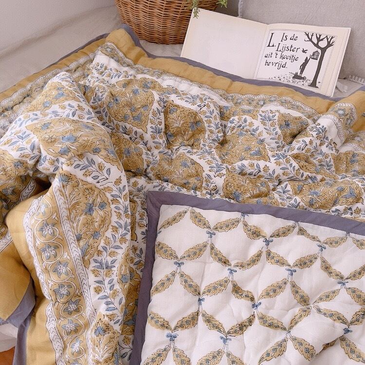 シックなナチュラルイエローのブロックプリントの綿入りキルトです。