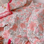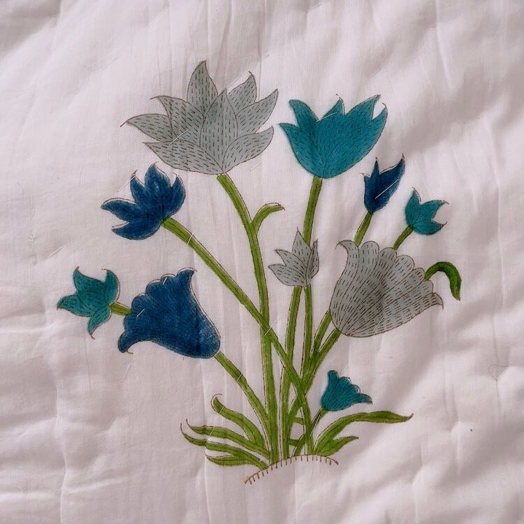 とても可愛らしいお花柄のブロックプリントの綿入りキルトです。