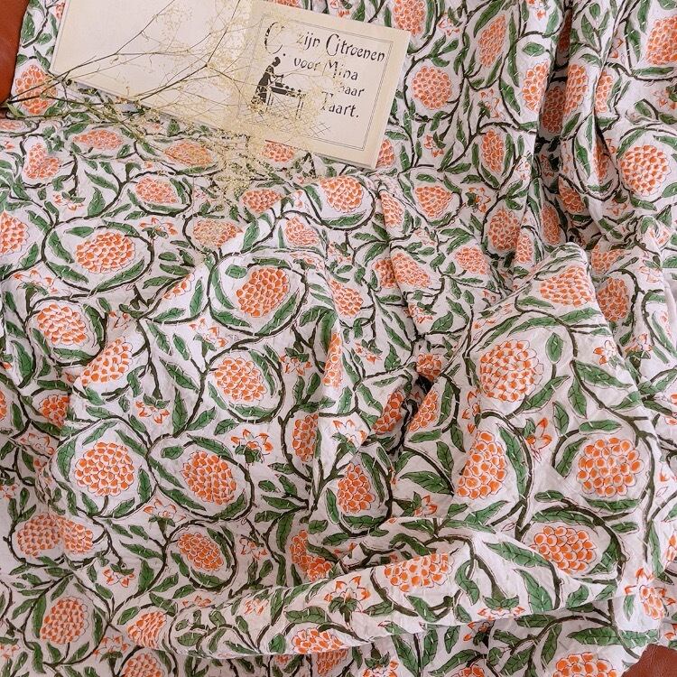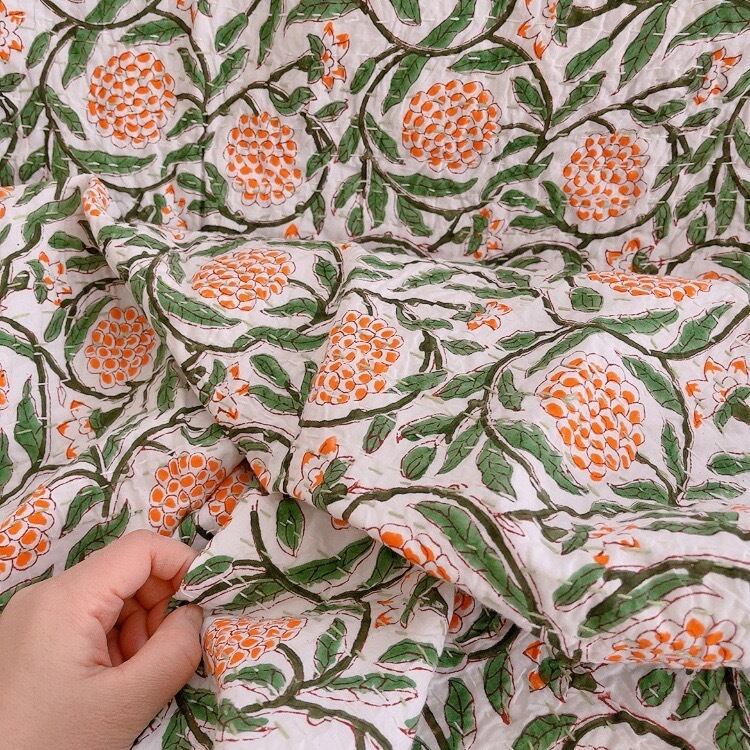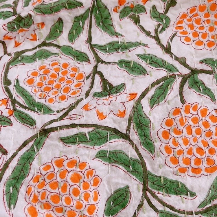 白地にオレンジお花柄の可愛らしいデザインのブロックプリントキルトです。