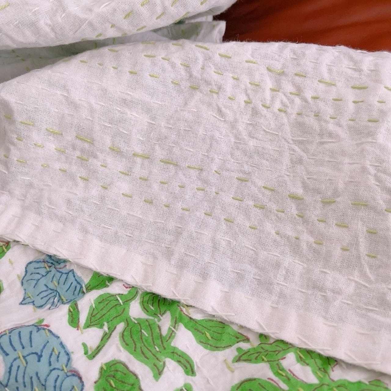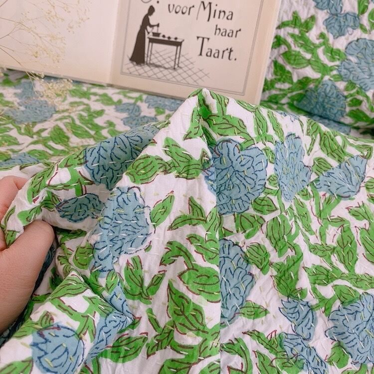 ブロックプリントキルトの優しい風合いのお色味が