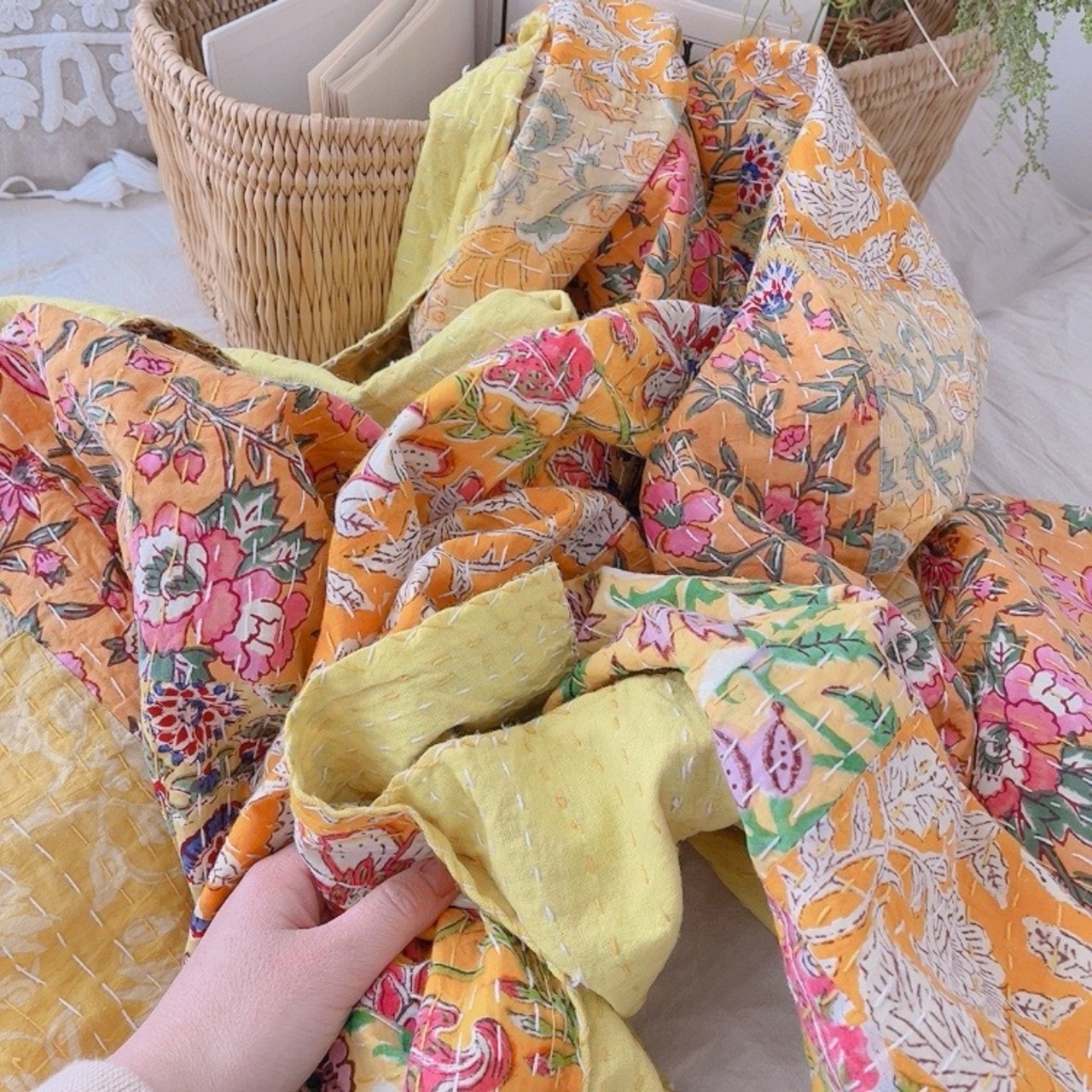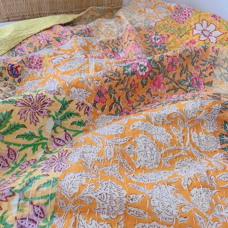 イエロー系のブロックプリント生地を集めたビーサイズのキルトです。