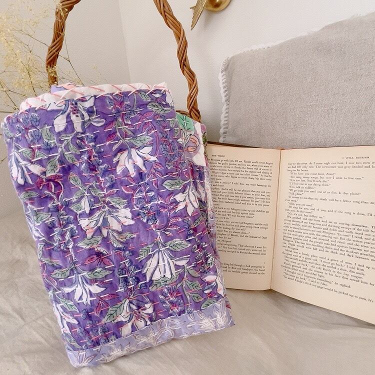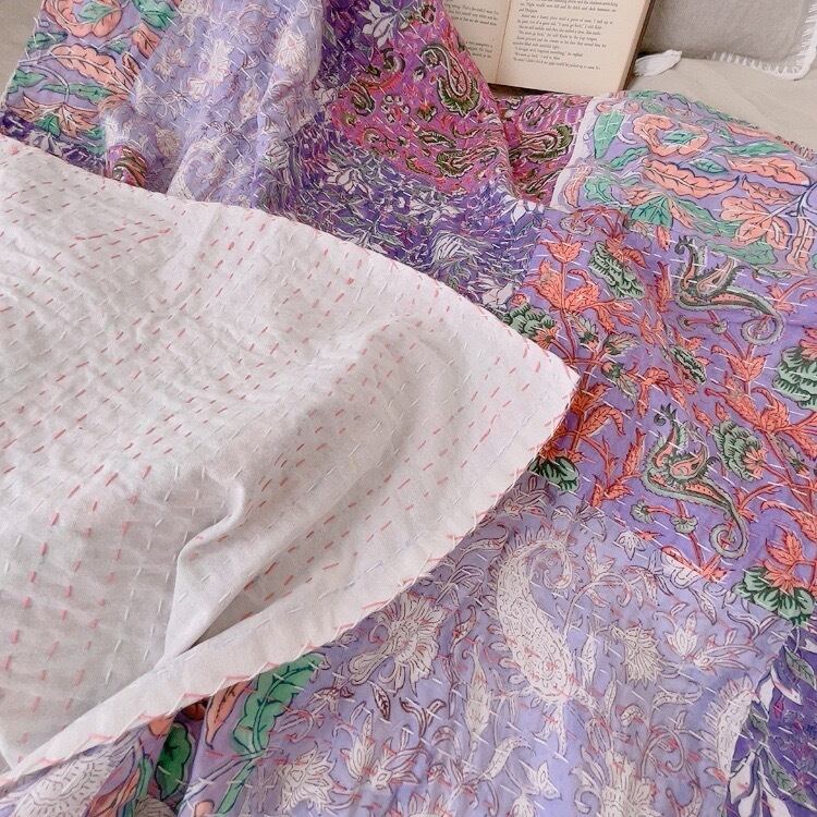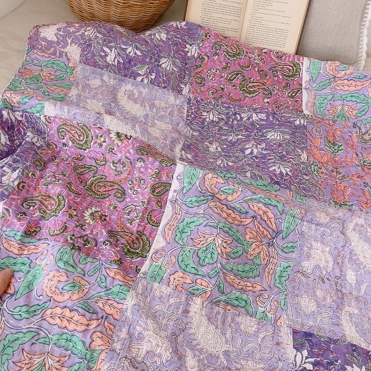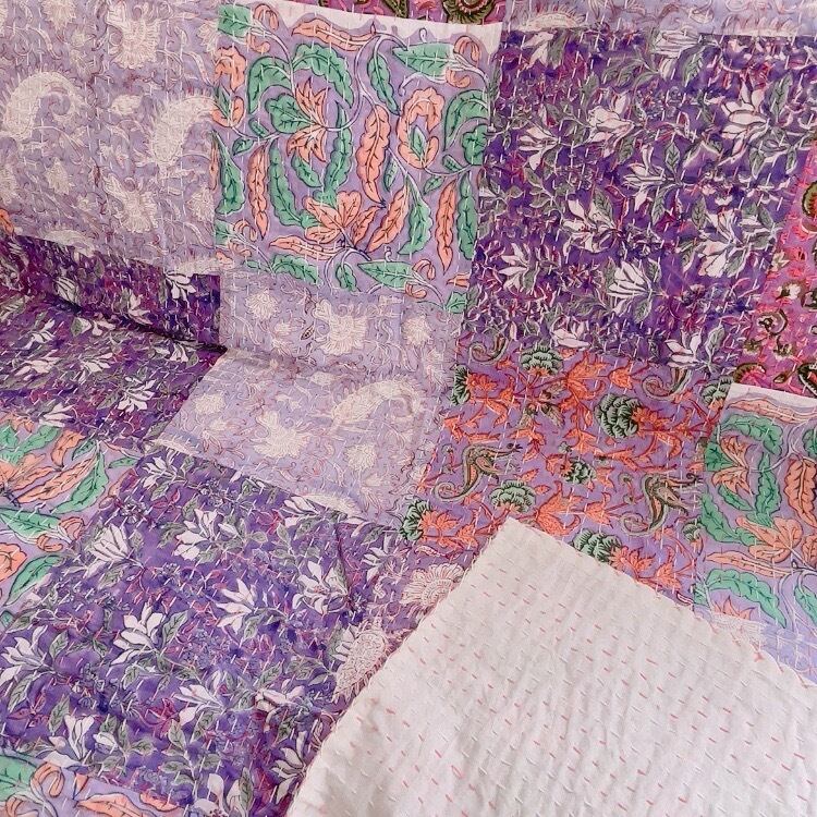 パープル系のブロックプリント生地を集めたビーサイズのキルトです。