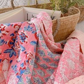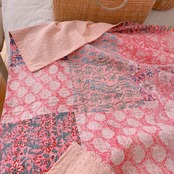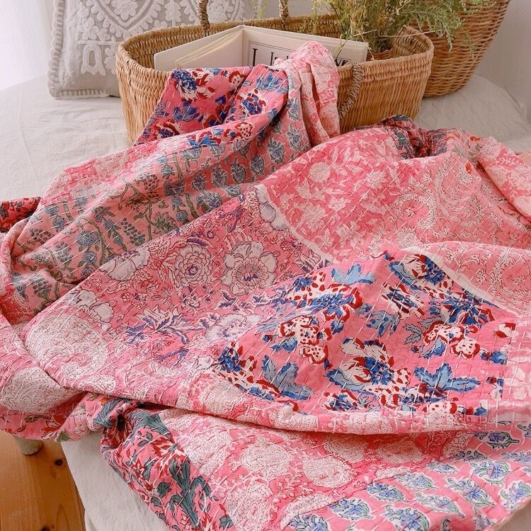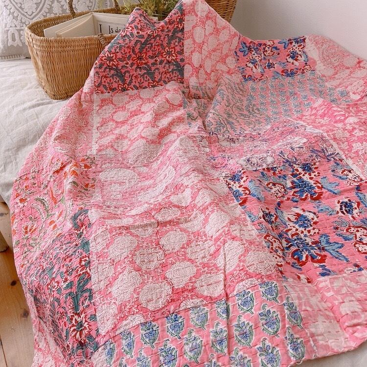 ピンク系のブロックプリント生地を集めたビーサイズのキルトです。