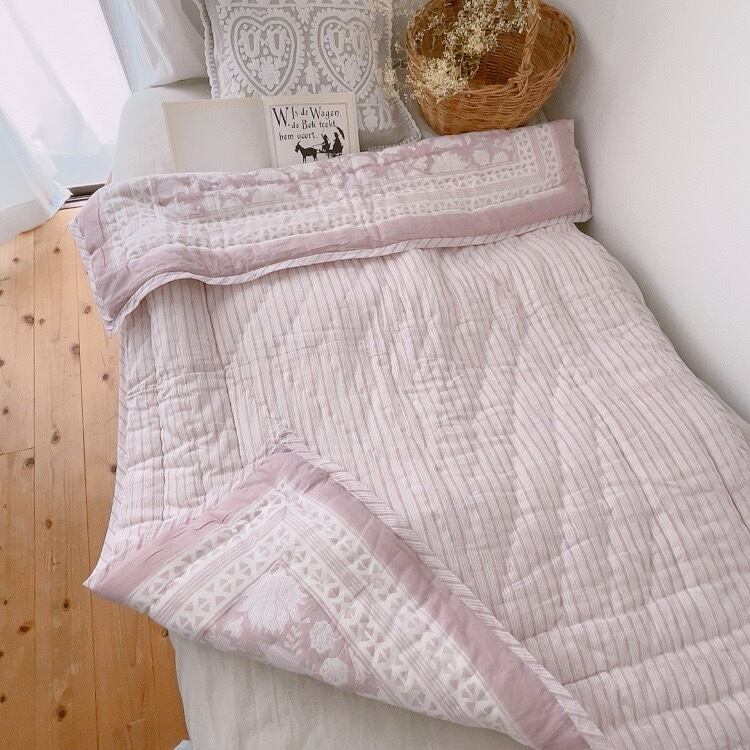とても可愛らしいお花柄のブロックプリントの綿入りキルトです。