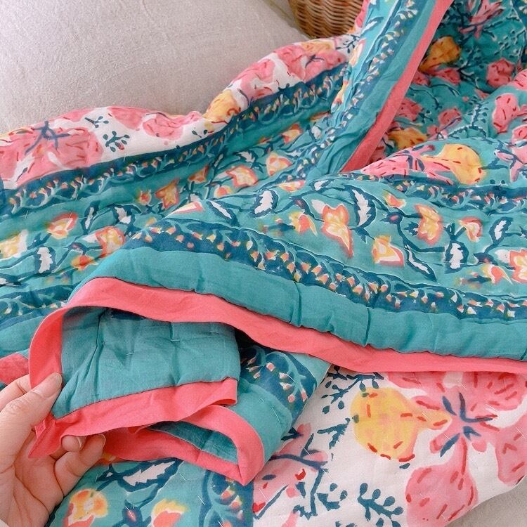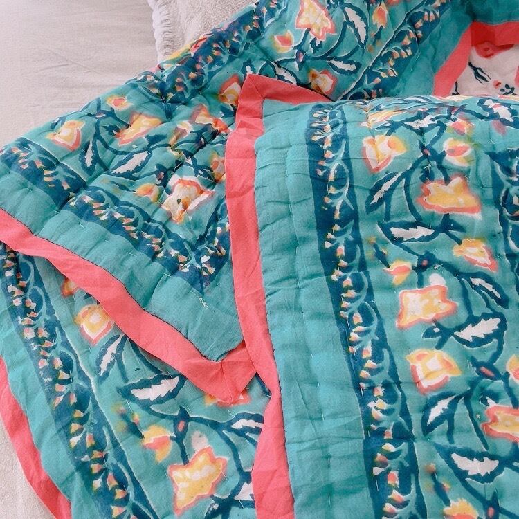 とても可愛らしいお花柄のブロックプリントの綿入りキルトです。