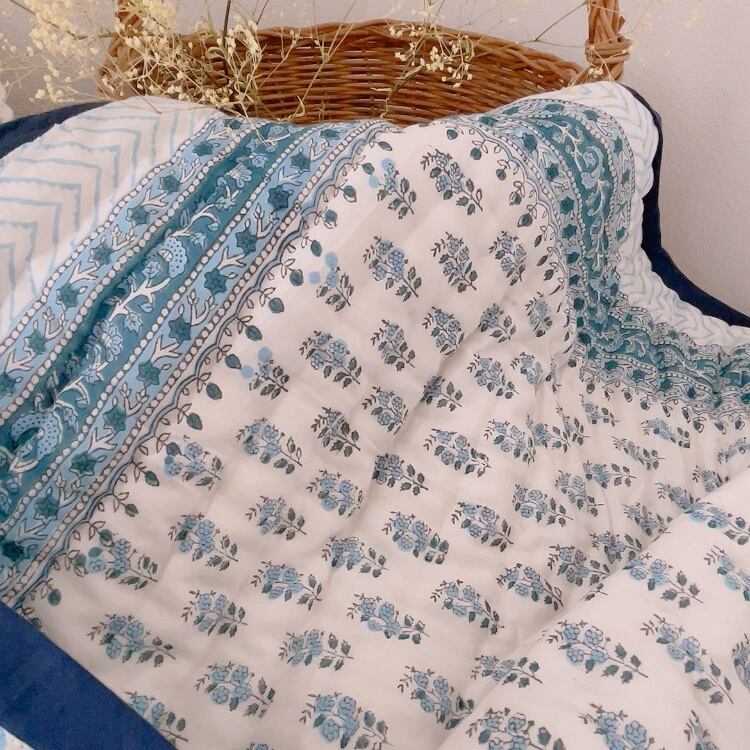 綿入り【big baby】ブルーフラワー ブロックプリントキルト