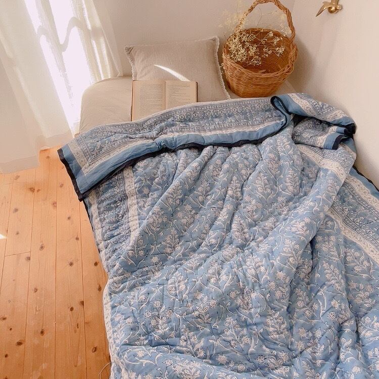 綿入り【M】フレンチブルー ブロックプリントキルト