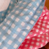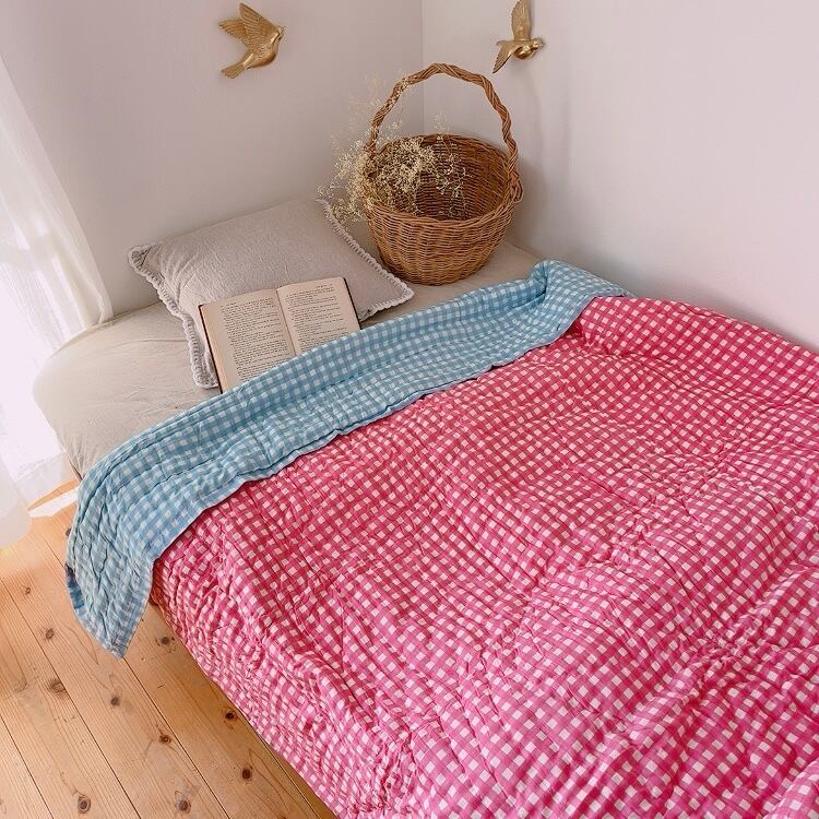綿入り【M】ピンク×ブルーグレーチェック ブロックプリントキルト