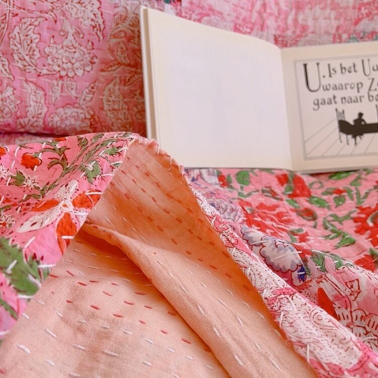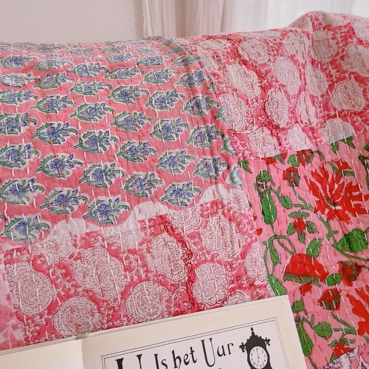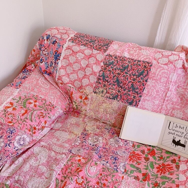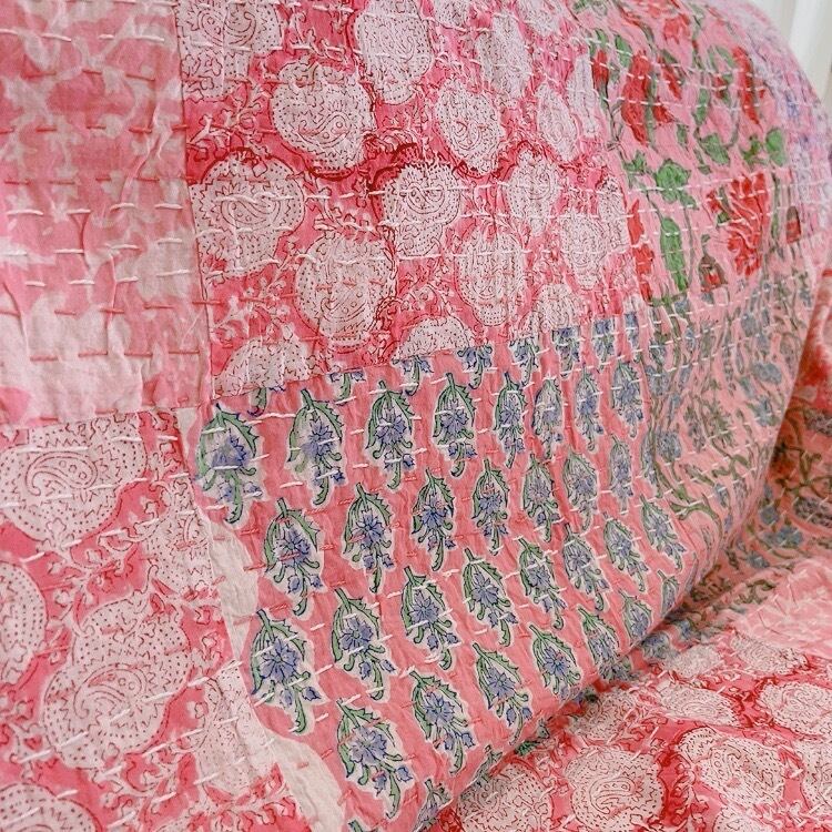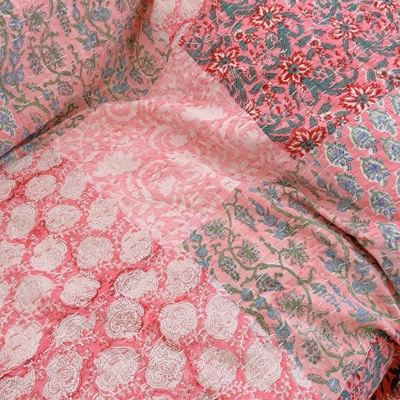 【M】Peachピンクパッチワークキルト ブロックプリントキルト