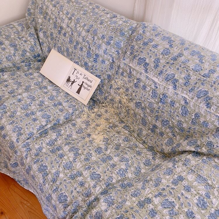 【Mほんのりブルーフラワー ブロックプリントキルト カンタキルト